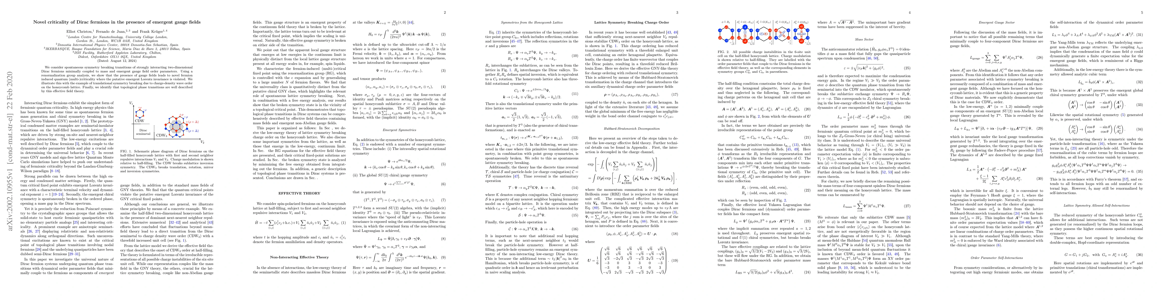 Summary: This paper explores how emergent gauge fields affect strongly interacting two-dimensional Dirac fermions, revealing novel quantum criticality and violation of emergent Lorentz invariance, illustrated through charge-density wave order on a honeycomb lattice, with topological phase transitions well described by an effective field theory.