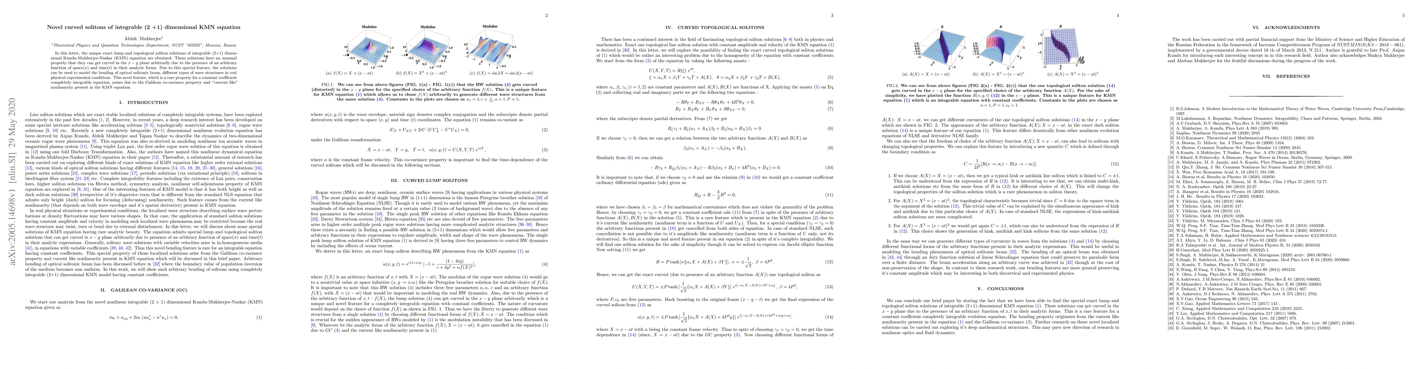 This paper presents novel curved lump and topological soliton solutions for the integrable (2+1) dimensional KMN equation, characterized by their ability to bend arbitrarily due to an arbitrary function of space and time. These unique solutions, enabled by the equation's Galilean covariance and current-like nonlinearity, can model optical solitonic beams and various wave structures in physical experiments.