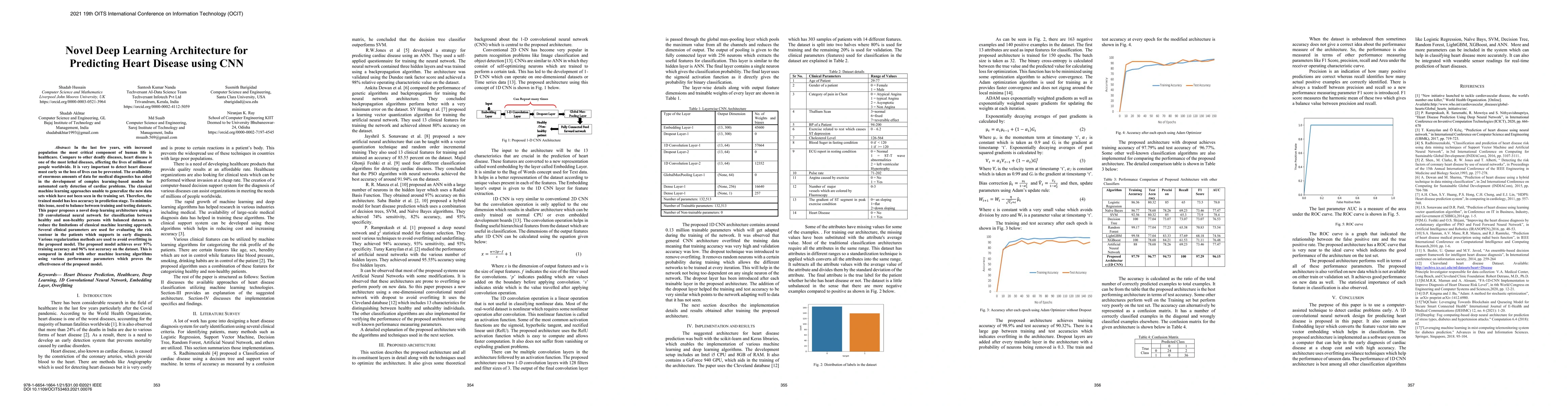This paper proposes a novel deep learning architecture using a 1D convolutional neural network to predict heart disease with high accuracy, achieving over 97% training accuracy and 96% test accuracy. The model outperforms classical methods by effectively avoiding overfitting and generalizing well to new data.