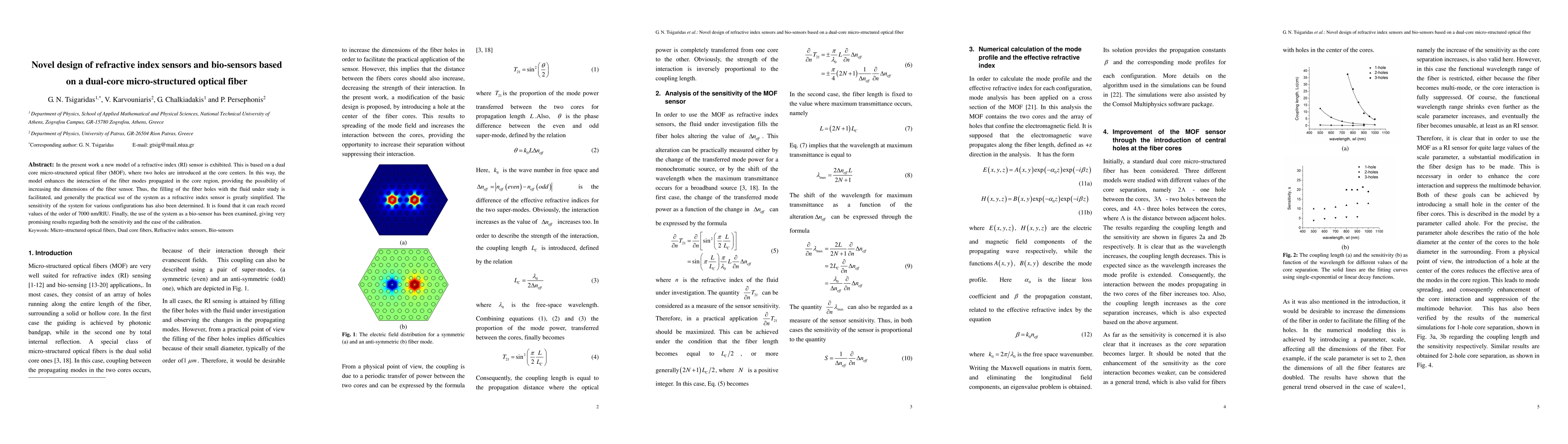 In the present work a new model of a refractive index (RI) sensor is exhibited. This is based on a dual core micro-structured optical fiber (MOF), where two holes are introduced at the core centers. In this way, the model enhances the interaction of the fiber modes propagated in the core region, providing the possibility of increasing the dimensions of the fiber sensor. Thus, the filling of the fiber holes with the fluid under study is facilitated, and generally the practical use of the system as a refractive index sensor is greatly simplified. The sensitivity of the system for various configurations has also been determined. It is found that it can reach record values of the order of 7000 nm/RIU. Finally, the use of the system as a bio-sensor has been examined, giving very promising results regarding both the sensitivity and the ease of the calibration.