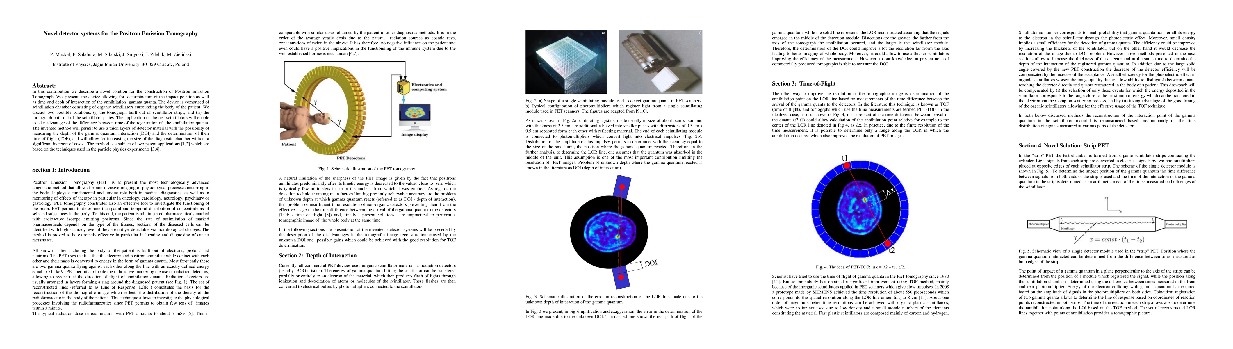In this contribution we describe a novel solution for the construction of Positron Emission Tomograph. We present the device allowing for determination of the impact position as well as time and deph of interaction of the annihilation gamma quanta. The device is comprised of scintillation chamber consisting of organic scintillators surrounding the body of the patient. We discuss two possible solutions: (i) the tomograph built out of scintillator strips, and (ii) the tomograph built out of the scintillator plates. The application of the fast scintillators will enable to take advantage of the difference between time of the registration of the annihilation quanta. The invented method will permit to use a thick layers of detector material with the possibility of measuring the depth of the gamma quantum interaction (DOI) and the determination of their time of flight (TOF), and will allow for increasing the size of the diagnostic chamber without a significant increase of costs. The method is a subject of two patent applications which are based on the techniques used in the particle physics experiments.