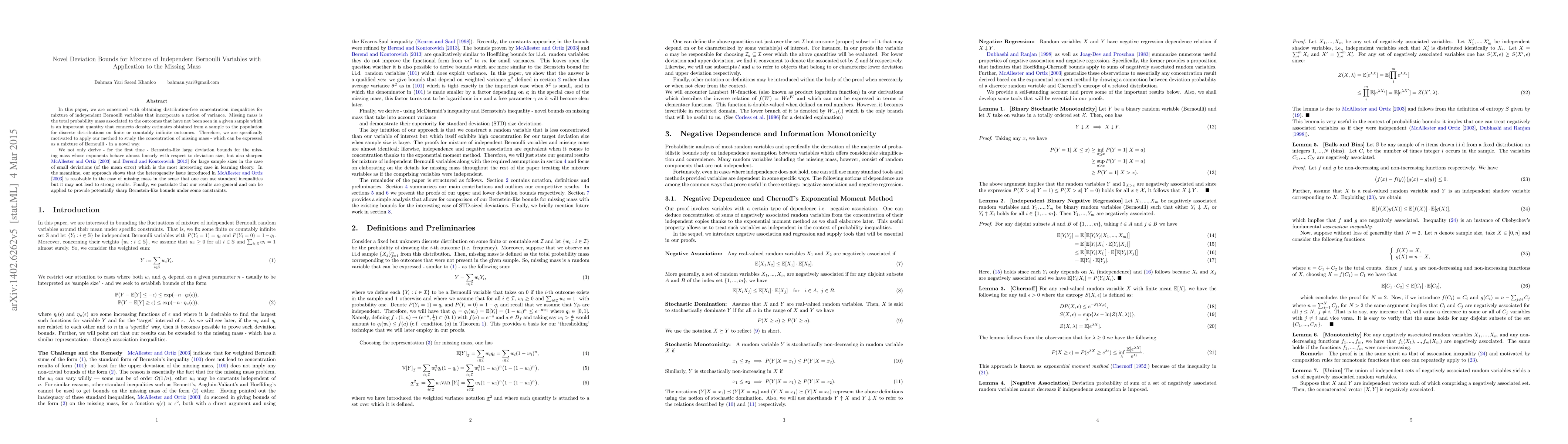 This paper introduces novel concentration inequalities for mixture of independent Bernoulli variables, specifically focusing on the missing mass in discrete distributions, providing new bounds that behave almost linearly with respect to deviation size.