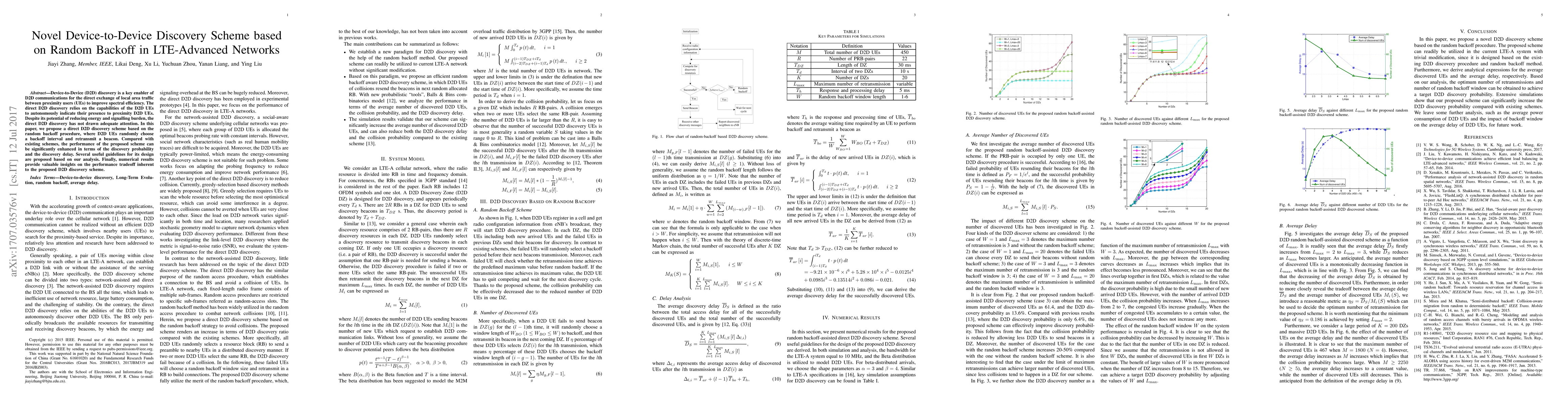 A new device-to-device discovery scheme is proposed for LTE-Advanced networks, using a random backoff procedure to improve discovery probability and delay. The scheme shows promise in enhancing D2D communications and reducing energy consumption.