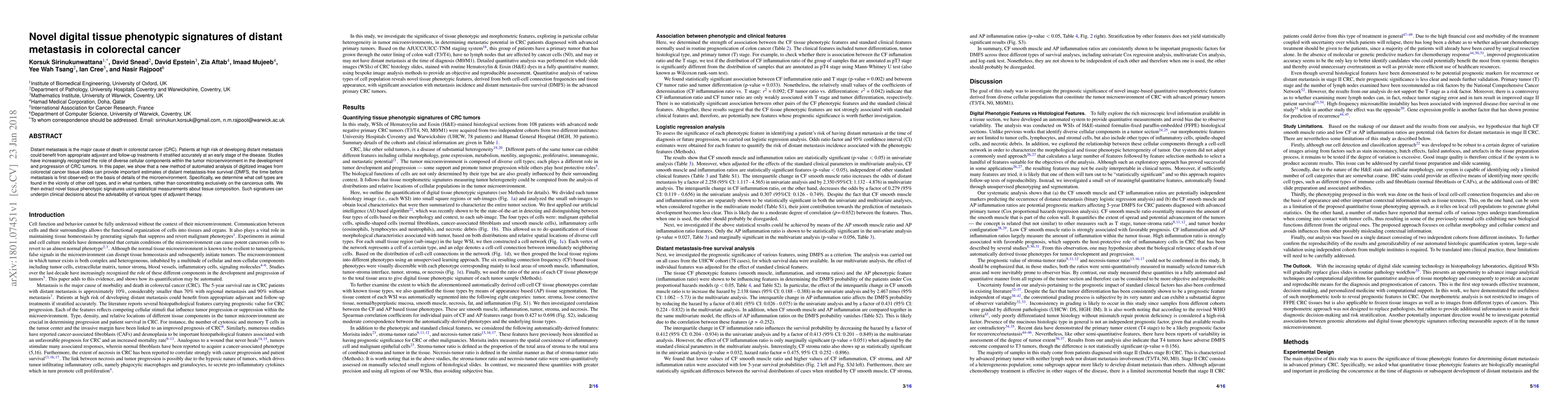 This paper introduces a novel digital method for analyzing digitized colorectal cancer tissue images to identify phenotypic signatures linked to distant metastasis. These signatures, derived from the tumor microenvironment's cellular composition, can help stratify patients at risk and guide decisions on adjuvant therapy.
