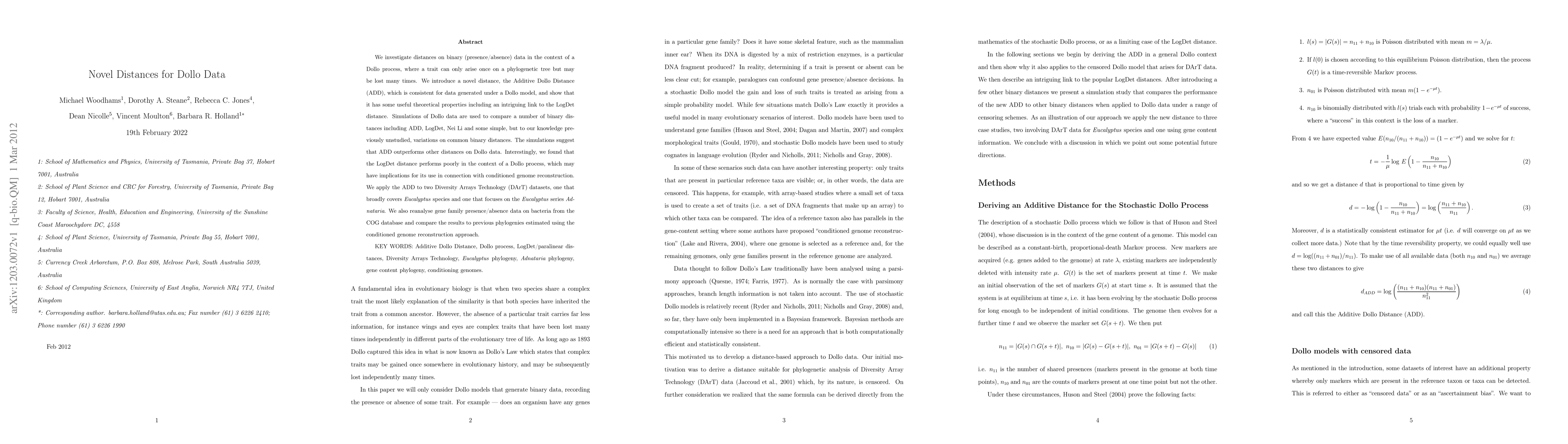 We investigate distances on binary (presence/absence) data in the context of a Dollo process, where a trait can only arise once on a phylogenetic tree but may be lost many times. We introduce a novel distance, the Additive Dollo Distance (ADD), which is consistent for data generated under a Dollo model, and show that it has some useful theoretical properties including an intriguing link to the LogDet distance. Simulations of Dollo data are used to compare a number of binary distances including ADD, LogDet, Nei Li and some simple, but to our knowledge previously unstudied, variations on common binary distances. The simulations suggest that ADD outperforms other distances on Dollo data. Interestingly, we found that the LogDet distance performs poorly in the context of a Dollo process, which may have implications for its use in connection with conditioned genome reconstruction. We apply the ADD to two Diversity Arrays Technology (DArT) datasets, one that broadly covers Eucalyptus species and one that focuses on the Eucalyptus series Adnataria. We also reanalyse gene family presence/absence data on bacteria from the COG database and compare the results to previous phylogenies estimated using the conditioned genome reconstruction approach.