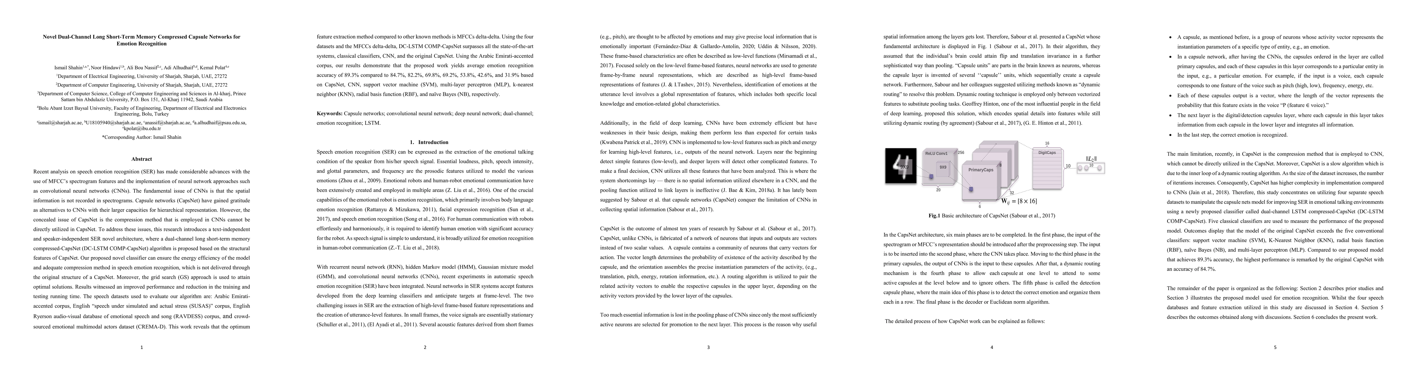 A novel speech emotion recognition algorithm, DC-LSTM COMP-CapsNet, outperforms state-of-the-art systems with improved accuracy and reduced training time using a dual-channel long short-term memory compressed capsule network architecture.