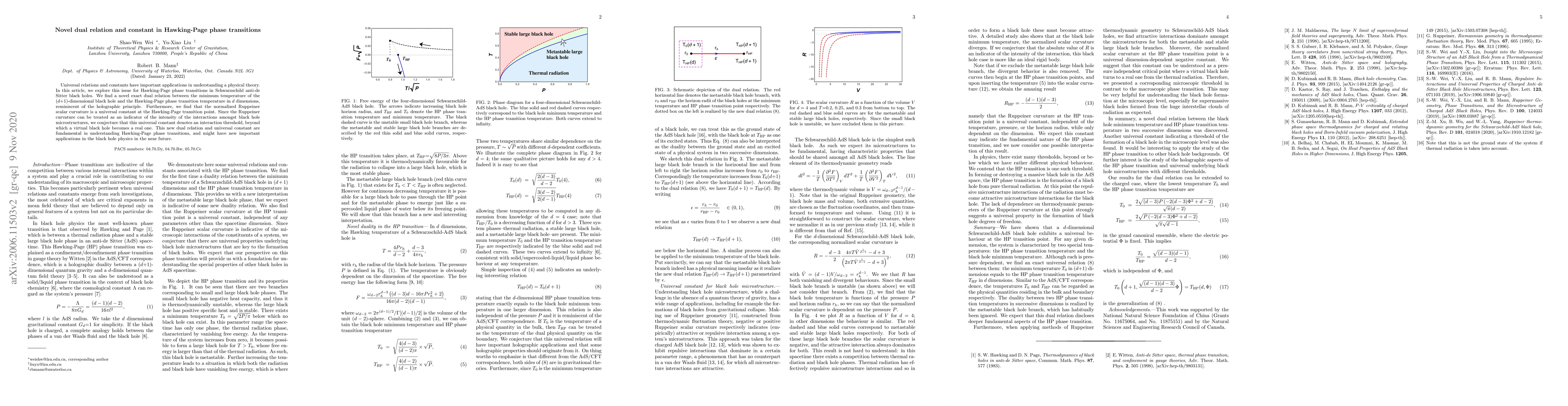 Universal relations and constants have important applications in understanding a physical theory. In this article, we explore this issue for Hawking-Page phase transitions in Schwarzschild anti-de Sitter black holes. We find a novel exact dual relation between the minimum temperature of the ($d$+1)-dimensional black hole and the Hawking-Page phase transition temperature in $d$ dimensions, reminiscent of the holographic principle. Furthermore, we find that the normalized Ruppeiner scalar curvature is a universal constant at the Hawking-Page transition point. Since the Ruppeiner curvature can be treated as an indicator of the intensity of the interactions amongst black hole microstructures, we conjecture that this universal constant denotes an interaction threshold, beyond which a virtual black hole becomes a real one. This new dual relation and universal constant are fundamental in understanding Hawking-Page phase transitions, and might have new important applications in the black hole physics in the near future.