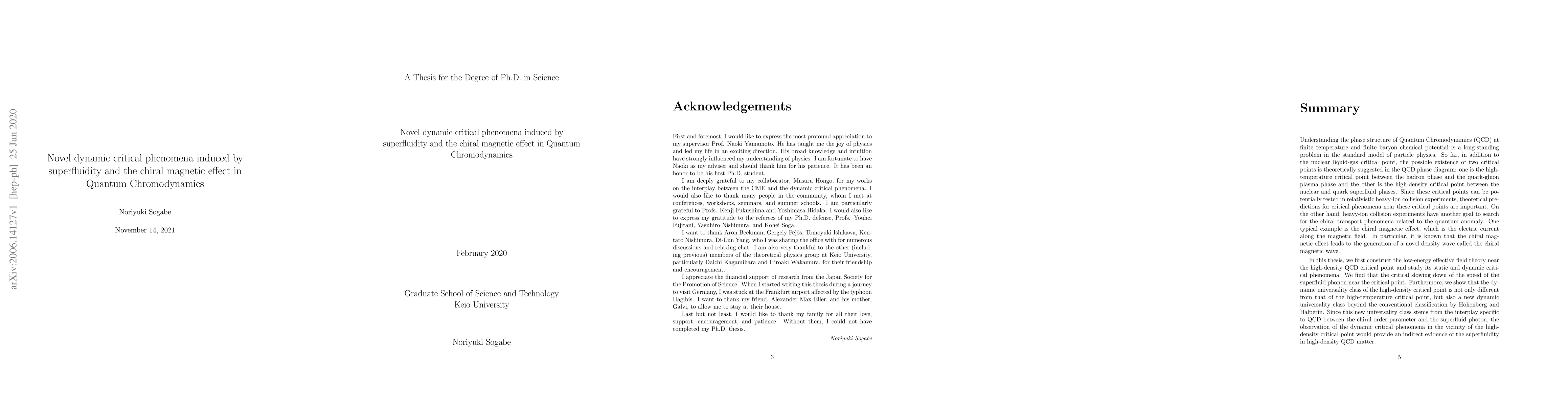 In this thesis, we study the novel dynamic critical phenomena induced by superfluidity and the chiral magnetic effect in Quantum Chromodynamics (QCD), respectively. In particular, we find the new dynamic universality class of the high-density QCD critical point between the nuclear and quark superfluid phases beyond the conventional Hohnenberg and Halperin's classification. We also consider the second-order chiral phase transition under an external magnetic field and find that the inclusion of the chiral magnetic effect changes the dynamic universality class from the model E into model A within the conventional classification.