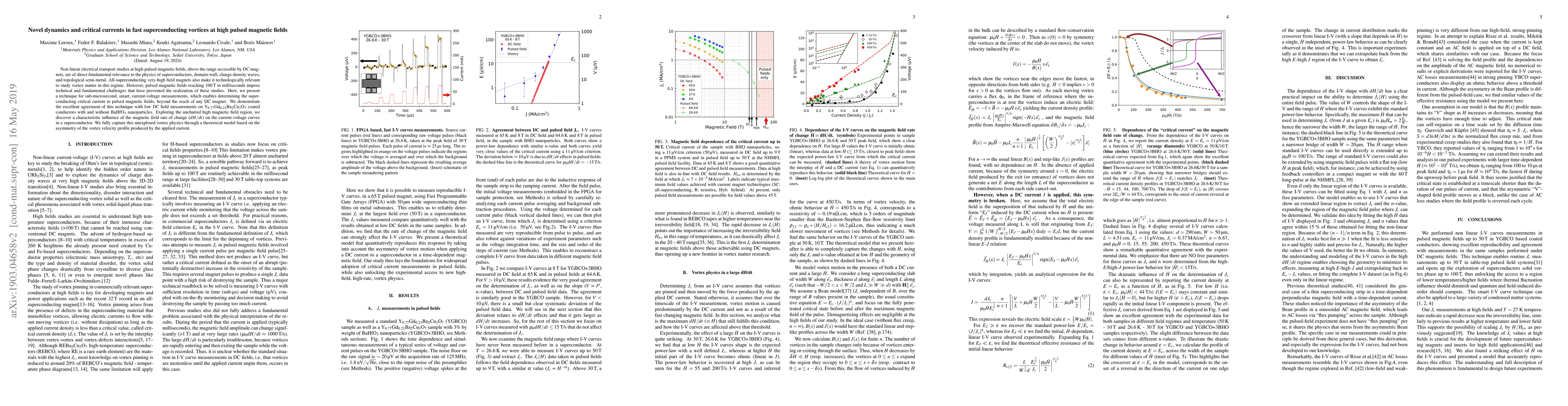 Non-linear electrical transport studies at high-pulsed magnetic fields, above the range accessible by DC magnets, are of direct fundamental relevance to the physics of superconductors, domain-wall, charge-density waves, and topological semi-metal. All-superconducting very-high field magnets also make it technologically relevant to study vortex matter in this regime. However, pulsed magnetic fields reaching 100 T in milliseconds impose technical and fundamental challenges that have prevented the realization of these studies. Here, we present a technique for sub-microsecond, smart, current-voltage measurements, which enables determining the superconducting critical current in pulsed magnetic fields, beyond the reach of any DC magnet. We demonstrate the excellent agreement of this technique with low DC field measurements on Y$_{0.77}$Gd$_{0.23}$Ba$_2$Cu$_3$O$_7$ coated conductors with and without BaHfO$_3$ nanoparticles. Exploring the uncharted high magnetic field region, we discover a characteristic influence of the magnetic field rate of change ($dH/dt$) on the current-voltage curves in a superconductor. We fully capture this unexplored vortex physics through a theoretical model based on the asymmetry of the vortex velocity profile produced by the applied current.