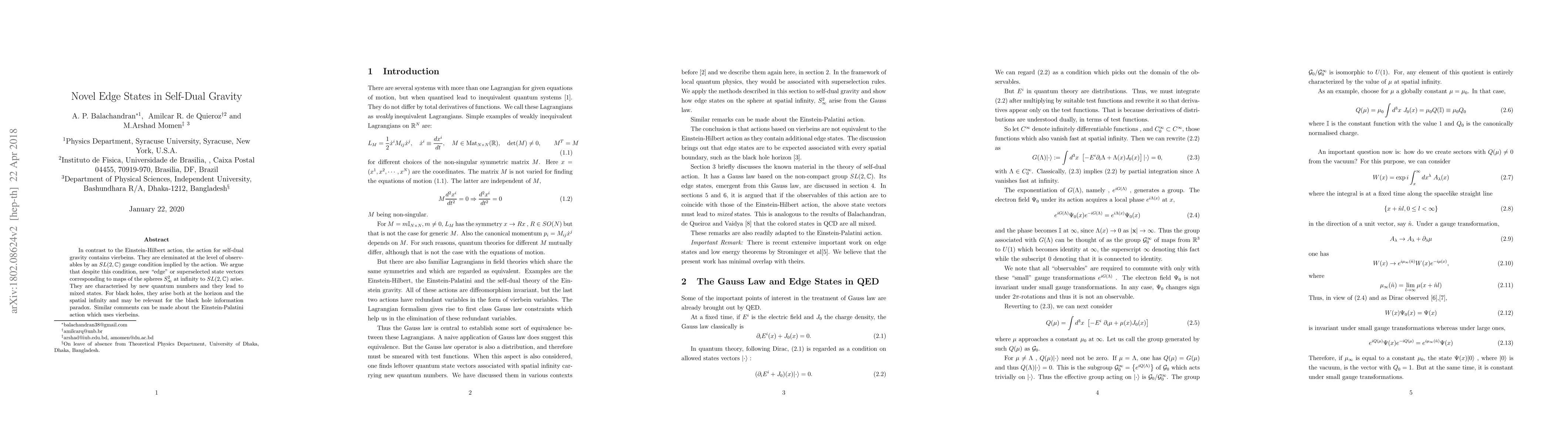 In contrast to the Einstein-Hilbert action, the action for self-dual gravity contains vierbeins. They are eleminated at the level of observables by an $SL(2,\mathbb{C})$ gauge condition implied by the action. We argue that despite this condition, new "edge" or superselected state vectors corresponding to maps of the spheres $S^2_{\infty}$ at infinity to $SL(2, \mathbb{C})$ arise. They are characterised by new quantum numbers and they lead to mixed states. For black holes, they arise both at the horizon and the spatial infinity and may be relevant for the black hole information paradox. Similar comments can be made about the Einstein-Palatini action which uses vierbeins.