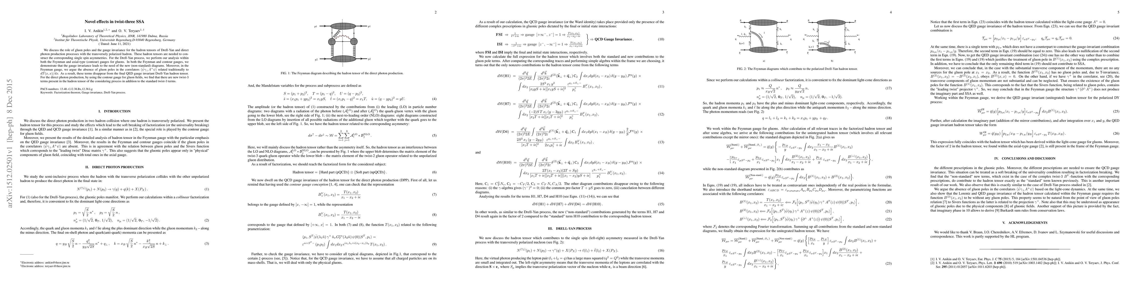 We discuss the role of gluon poles and the gauge invariance for the hadron tensors of Drell-Yan and direct photon production processes with the transversely polarized hadron. These hadron tensors are needed to construct the corresponding single spin asymmetries. For the Drell-Yan process, we perform our analysis within both the Feynman and axial-type (contour) gauges for gluons. In both the Feynman and contour gauges, we demonstrate that the gauge invariance leads to the need of the new (non-standard) diagrams. Moreover, in the Feynman gauge, we argue the absence of gluon poles in the correlators $\langle\bar\psi\gamma_\perp A^+\psi\rangle$ related traditionally to $dT(x,x)/dx$. As a result, these terms disappear from the final QED gauge invariant Drell-Yan hadron tensor. For the direct photon production, by using the contour gauge for gluon fields, we find that there are new twist-$3$ terms present in the hadron tensor of the considering process in addition to the standard twist-$3$ terms.