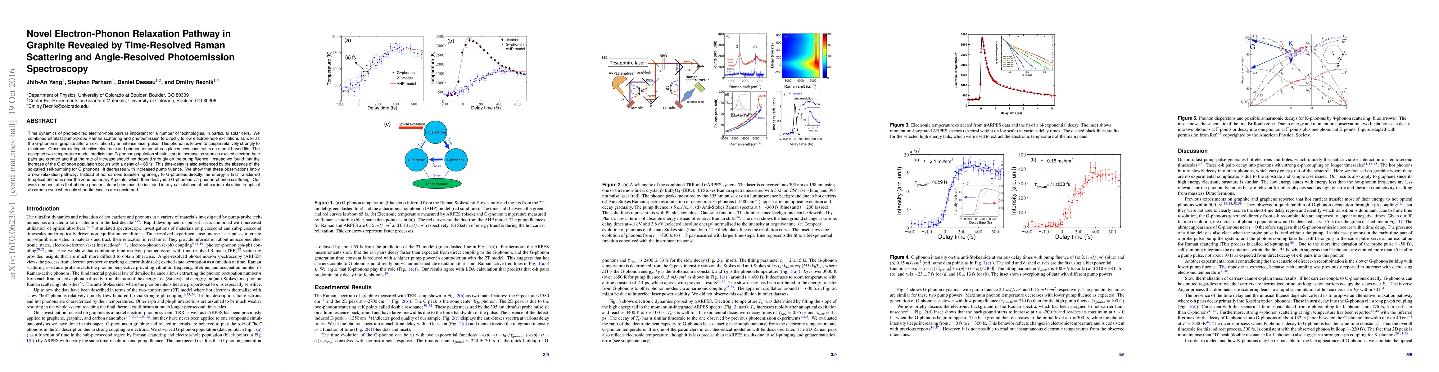 Time dynamics of photoexcited electron-hole pairs is important for a number of technologies, in particular solar cells. We combined ultrafast pump-probe Raman scattering and photoemission to directly follow electron-hole excitations as well as the G-phonon in graphite after an excitation by an intense laser pulse. This phonon is known to couple relatively strongly to electrons. Cross-correlating effective electronic and phonon temperatures places new constraints on model-based fits. The accepted two-temperature model predicts that G-phonon population should start to increase as soon as excited electron-hole pairs are created and that the rate of increase should not depend strongly on the pump fluence. Instead we found that the increase of the G-phonon population occurs with a delay of $\sim$65 fs. This time-delay is also evidenced by the absence of the so-called self-pumping for G phonons. It decreases with increased pump fluence. We show that these observations imply a new relaxation pathway: Instead of hot carriers transferring energy to G-phonons directly, the energy is first transferred to optical phonons near the zone boundary K-points, which then decay into G-phonons via phonon-phonon scattering. Our work demonstrates that phonon-phonon interactions must be included in any calculations of hot carrier relaxation in optical absorbers even when only short timescales are considered.