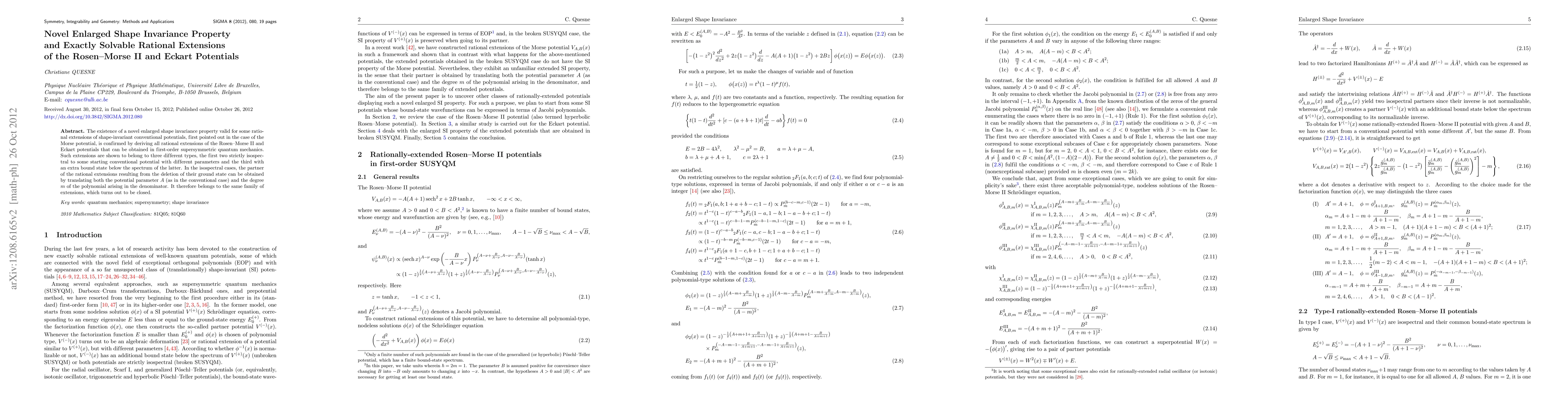 This paper confirms a novel enlarged shape invariance property for rational extensions of the Rosen-Morse II and Eckart potentials in supersymmetric quantum mechanics. It identifies three types of extensions, two isospectral and one with an additional bound state, and demonstrates a closed family of these extensions.