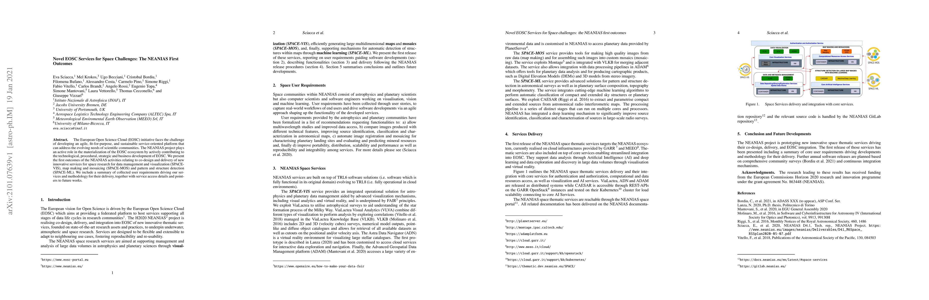 The European Open Science Cloud (EOSC) initiative faces the challenge of developing an agile, fit-for-purpose, and sustainable service-oriented platform that can address the evolving needs of scientific communities. The NEANIAS project plays an active role in the materialization of the EOSC ecosystem by actively contributing to the technological, procedural, strategic and business development of EOSC. We present the first outcomes of the NEANIAS activities relating to co-design and delivery of new innovative services for space research for data management and visualization (SPACE-VIS), map making and mosaicing (SPACE-MOS) and pattern and structure detection (SPACE-ML). We include a summary of collected user requirements driving our services and methodology for their delivery, together with service access details and pointers to future works.