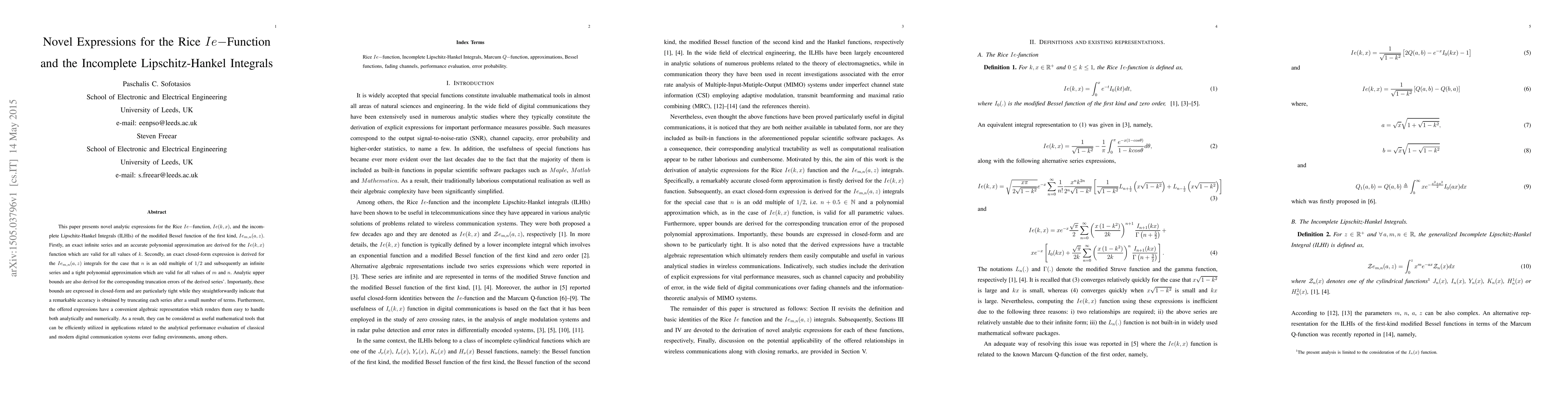 This paper presents novel analytic expressions for the Rice $Ie{-}$function, $Ie(k,x)$, and the incomplete Lipschitz-Hankel Integrals (ILHIs) of the modified Bessel function of the first kind, $Ie_{m,n}(a,z)$. Firstly, an exact infinite series and an accurate polynomial approximation are derived for the $Ie(k ,x)$ function which are valid for all values of $k$. Secondly, an exact closed-form expression is derived for the $Ie_{m,n}(a,z)$ integrals for the case that $n$ is an odd multiple of $1/2$ and subsequently an infinite series and a tight polynomial approximation which are valid for all values of $m$ and $n$. Analytic upper bounds are also derived for the corresponding truncation errors of the derived series'. Importantly, these bounds are expressed in closed-form and are particularly tight while they straightforwardly indicate that a remarkable accuracy is obtained by truncating each series after a small number of terms. Furthermore, the offered expressions have a convenient algebraic representation which renders them easy to handle both analytically and numerically. As a result, they can be considered as useful mathematical tools that can be efficiently utilized in applications related to the analytical performance evaluation of classical and modern digital communication systems over fading environments, among others.