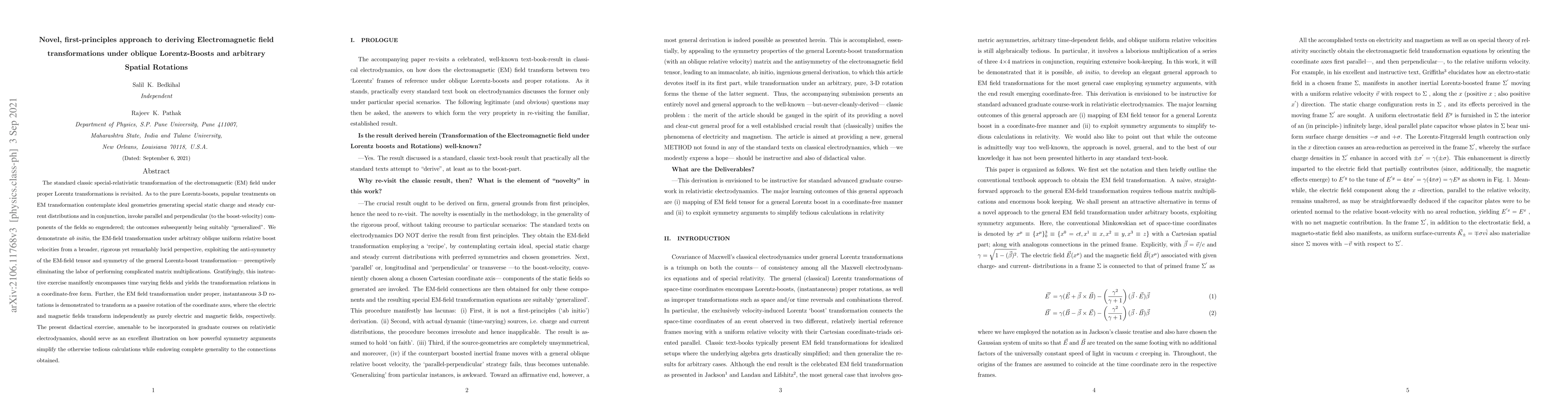 This paper presents a novel, first-principles method for deriving electromagnetic field transformations under oblique Lorentz-boosts and arbitrary spatial rotations, leveraging symmetry arguments to simplify calculations and achieve coordinate-free transformation relations. The approach also demonstrates how the EM field transforms under 3D rotations as a passive rotation of coordinate axes.