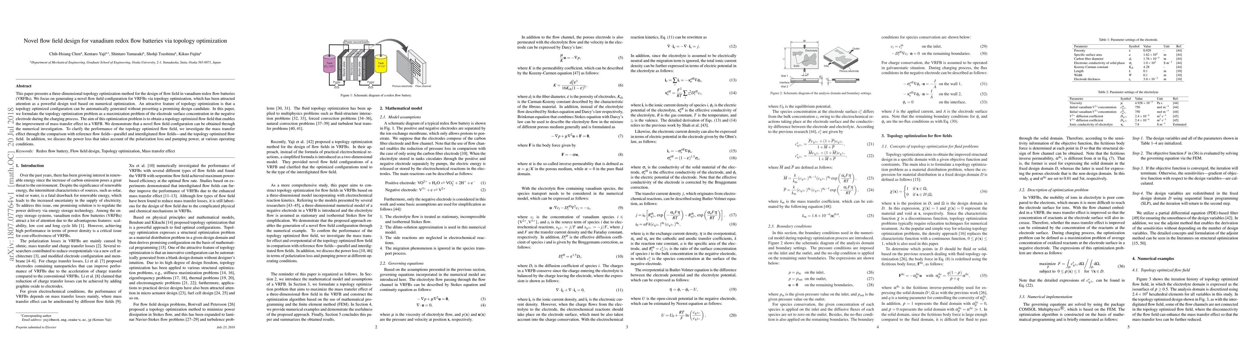This paper introduces a three-dimensional topology optimization method to design novel flow fields for vanadium redox flow batteries, aiming to enhance mass transfer efficiency. The study demonstrates improved performance compared to conventional parallel and interdigitated flow fields, while also considering power loss factors.