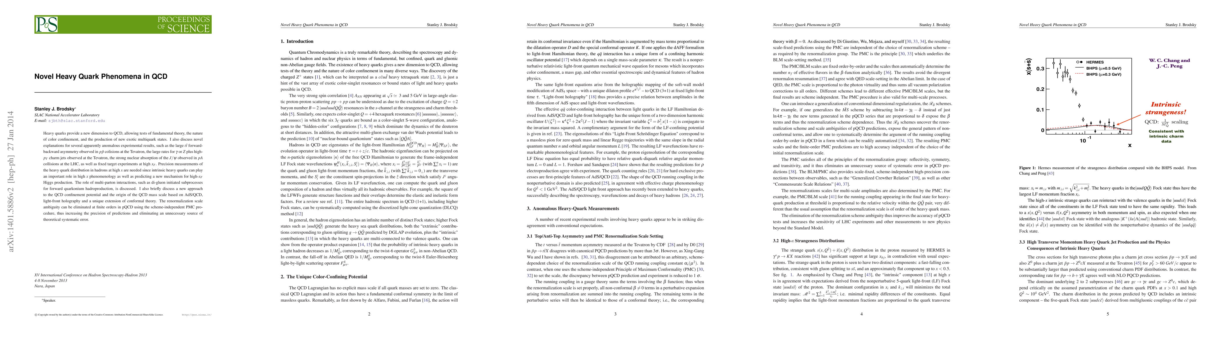 Heavy quarks provide a new dimension to QCD, allowing tests of fundamental theory, the nature of color confinement, and the production of new exotic multiquark states. I also discuss novel explanations for several apparently anomalous experimental results, such as the large $t \bar t$ forward-backward asymmetry observed in $p \bar p$ colisions at the Tevatron, the large rates for $\gamma$ or $Z$ plus high-$p_T$ charm jets observed at the Tevatron, the strong nuclear absorption of the $J/\psi$ observed in $pA$ collisions at the LHC, as well as fixed target experiments at high $x_F$. Precision measurements of the heavy quark distribution in hadrons at high $x$ are needed since intrinsic heavy quarks can play an important role in high $x$ phenomenology as well as predicting a new mechanism for high-$x_F$ Higgs production. The role of multi-parton interactions, such as di-gluon initiated subprocesses for forward quarkonium hadroproduction, is discussed. I also briefly discuss a new approach to the QCD confinement potential and the origin of the QCD mass scale based on AdS/QCD, light-front holography and a unique extension of conformal theory. The renormalization scale ambiguity can be eliminated at finite orders in pQCD using the scheme-independent PMC procedure, thus increasing the precision of predictions and eliminating an unnecessary source of theoretical systematic error.
