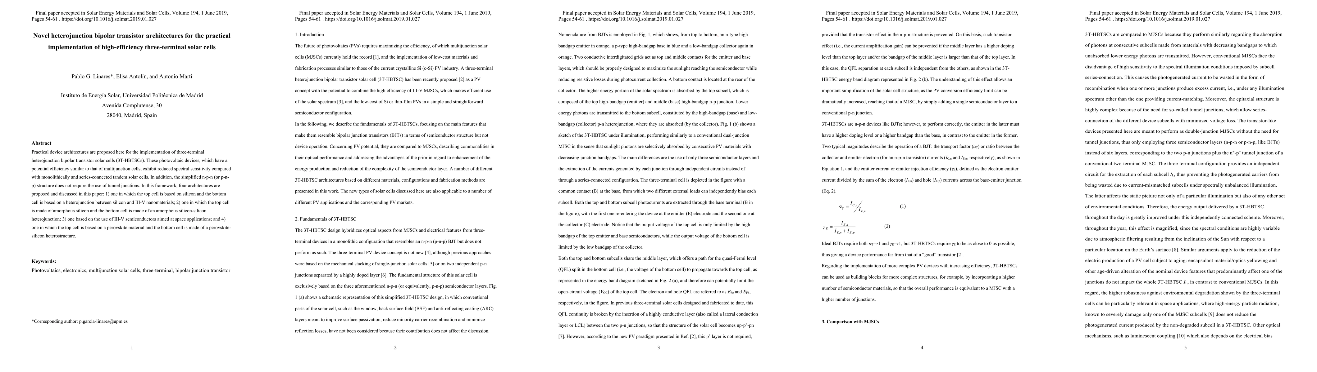 Practical device architectures are proposed here for the implementation of three-terminal heterojunction bipolar transistor solar cells (3T-HBTSCs). These photovoltaic devices, which have a potential efficiency similar to that of multijunction cells, exhibit reduced spectral sensitivity compared with monolithically and series-connected tandem solar cells. In addition, the simplified n-p-n (or p-n-p) structure does not require the use of tunnel junctions. In this framework, four architectures are proposed and discussed in this paper: 1) one in which the top cell is based on silicon and the bottom cell is based on a heterojunction between silicon and III-V nanomaterials; 2) one in which the top cell is made of amorphous silicon and the bottom cell is made of an amorphous silicon-silicon heterojunction; 3) one based on the use of III-V semiconductors aimed at space applications; and 4) one in which the top cell is based on a perovskite material and the bottom cell is made of a perovskite-silicon heterostructure.
