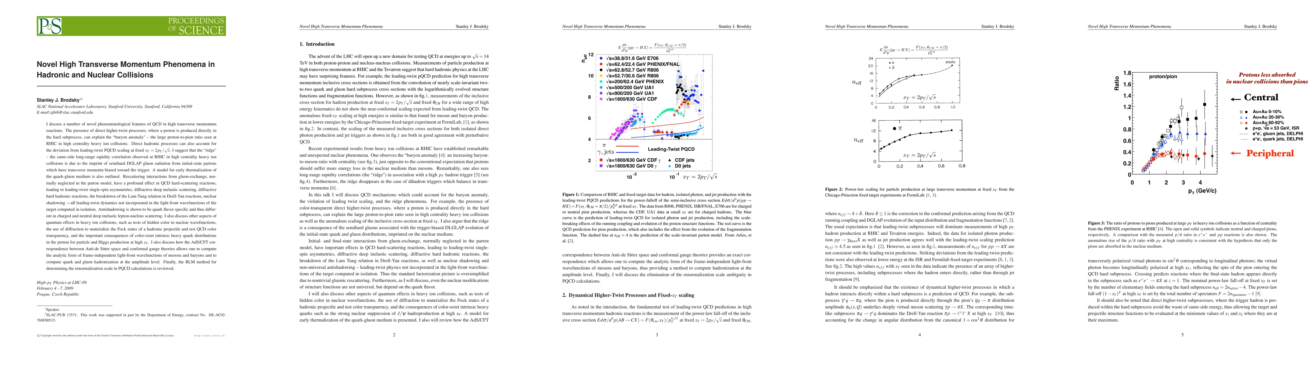 I discuss a number of novel phenomenological features of QCD in high transverse momentum reactions. The presence of direct higher-twist processes, where a proton is produced directly in the hard subprocess, can explain the "baryon anomaly" -- the large proton-to-pion ratio seen at RHIC in high centrality heavy ion collisions. Direct hadronic processes can also account for the deviation from leading-twist PQCD scaling at fixed x_T = 2p_T/\sqrt s. I suggest that the "ridge" -- the same-side long-range rapidity correlation observed at RHIC in high centrality heavy ion collisions is due to the imprint of semihard DGLAP gluon radiation from initial-state partons which have transverse momenta biased toward the trigger. Rescattering interactions from gluon-exchange, normally neglected in the parton model, have a profound effect in QCD hard-scattering reactions, leading to leading-twist single-spin asymmetries, diffractive deep inelastic scattering, diffractive hard hadronic reactions, the breakdown of the Lam-Tung relation in Drell-Yan reactions, nuclear shadowing --all leading-twist dynamics not incorporated in the light-front wavefunctions of the target computed in isolation. Antishadowing is shown to be quark flavor specific and thus different in charged and neutral deep inelastic lepton-nucleus scattering. I also discuss the consequences of color-octet intrinsic heavy quark distributions in the proton for heavy particle and Higgs production at high x_F. The AdS/CFT correspondence between Anti-de Sitter space and conformal gauge theories allows one to compute the analytic form of frame-independent light-front wavefunctions of mesons and baryons and to compute quark and gluon hadronization at the amplitude level.