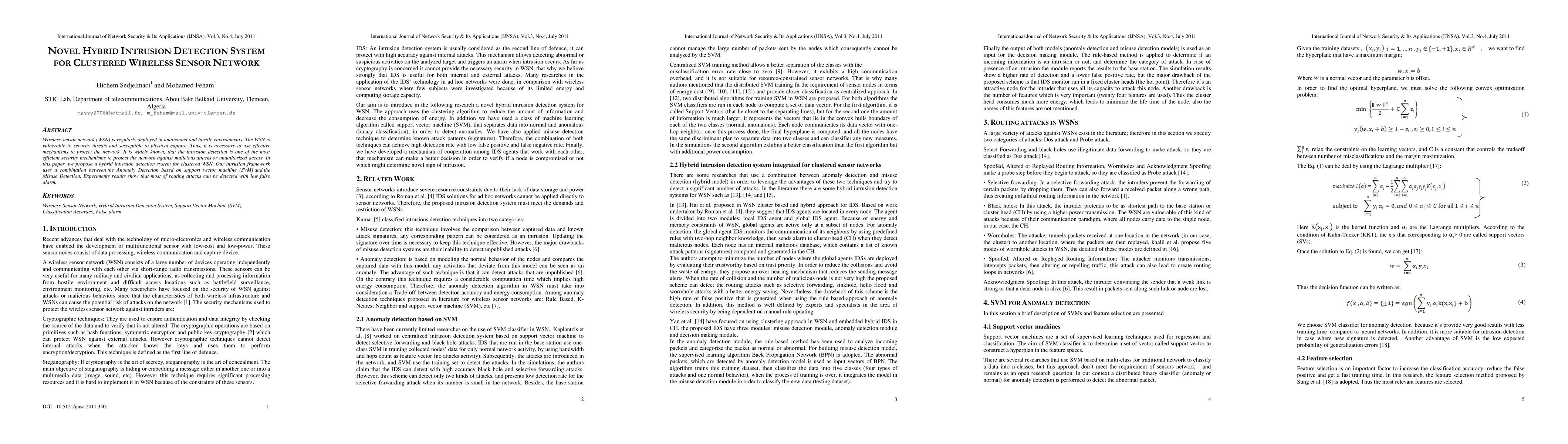 This paper proposes a hybrid intrusion detection system for clustered wireless sensor networks that combines Anomaly Detection using Support Vector Machines (SVM) with Misuse Detection to effectively identify routing attacks with low false alarm rates. Experimental results demonstrate the system's efficiency in protecting WSN against malicious attacks.