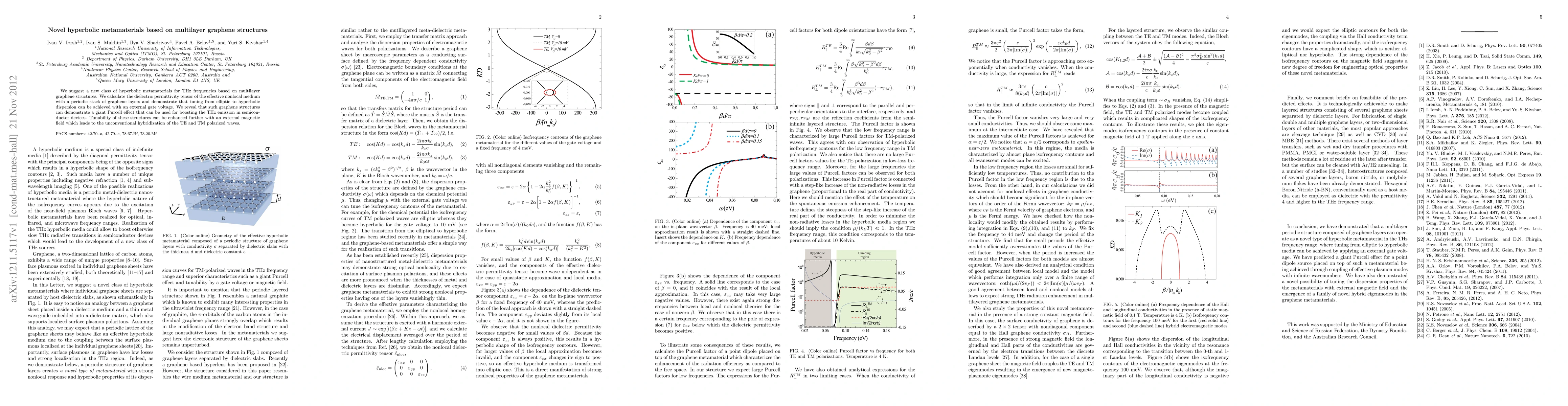 This paper proposes a new class of hyperbolic metamaterials based on multilayer graphene structures for THz frequencies, showing tunable dispersion from elliptic to hyperbolic via gate voltage. The structures exhibit a giant Purcell effect, enhancing THz emission in semiconductor devices, with additional tunability via an external magnetic field.
