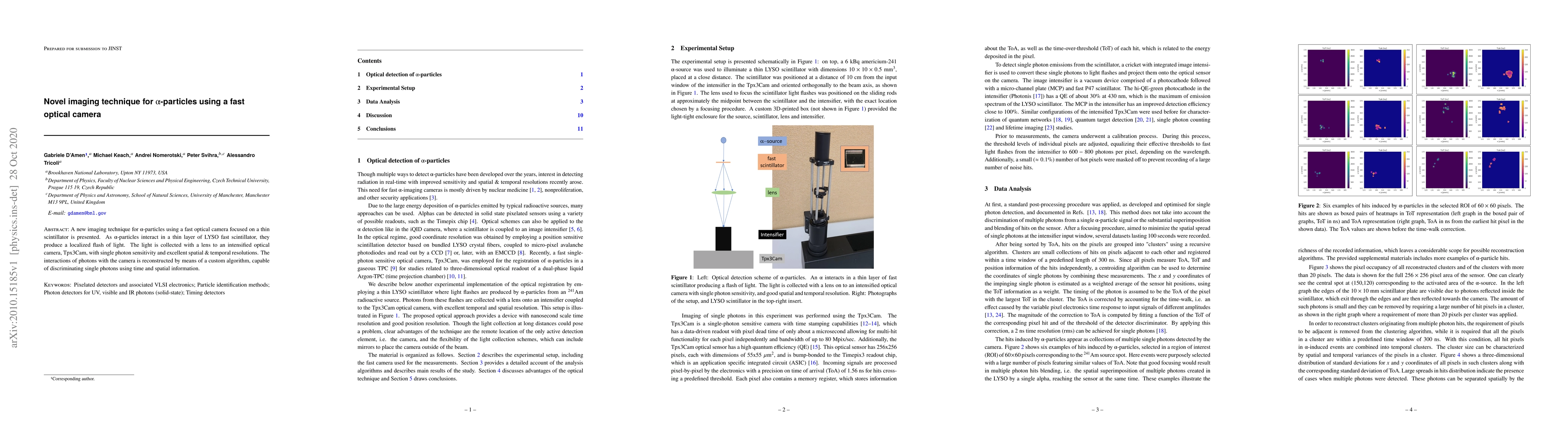 A new imaging technique for $\alpha$-particles using a fast optical camera focused on a thin scintillator is presented. As $\alpha$-particles interact in a thin layer of LYSO fast scintillator, they produce a localized flash of light. The light is collected with a lens to an intensified optical camera, Tpx3Cam, with single photon sensitivity and excellent spatial & temporal resolutions. The interactions of photons with the camera is reconstructed by means of a custom algorithm, capable of discriminating single photons using time and spatial information.