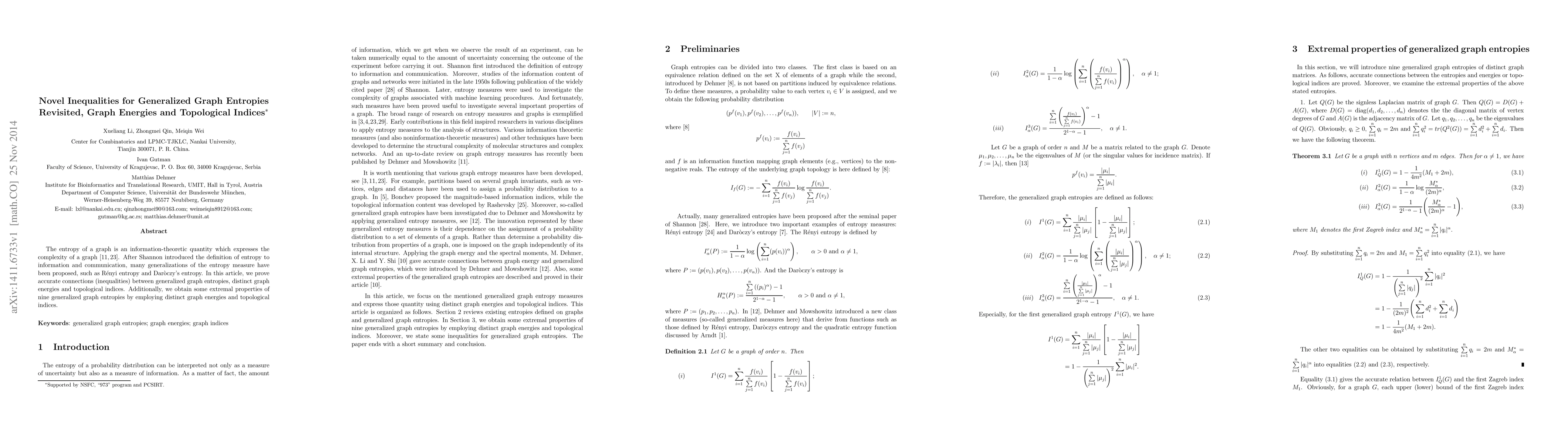 The entropy of a graph is an information-theoretic quantity which expresses the complexity of a graph \cite{DM1,M}. After Shannon introduced the definition of entropy to information and communication, many generalizations of the entropy measure have been proposed, such as R\'enyi entropy and Dar\`oczy's entropy. In this article, we prove accurate connections (inequalities) between generalized graph entropies, distinct graph energies and topological indices. Additionally, we obtain some extremal properties of nine generalized graph entropies by employing distinct graph energies and topological indices.