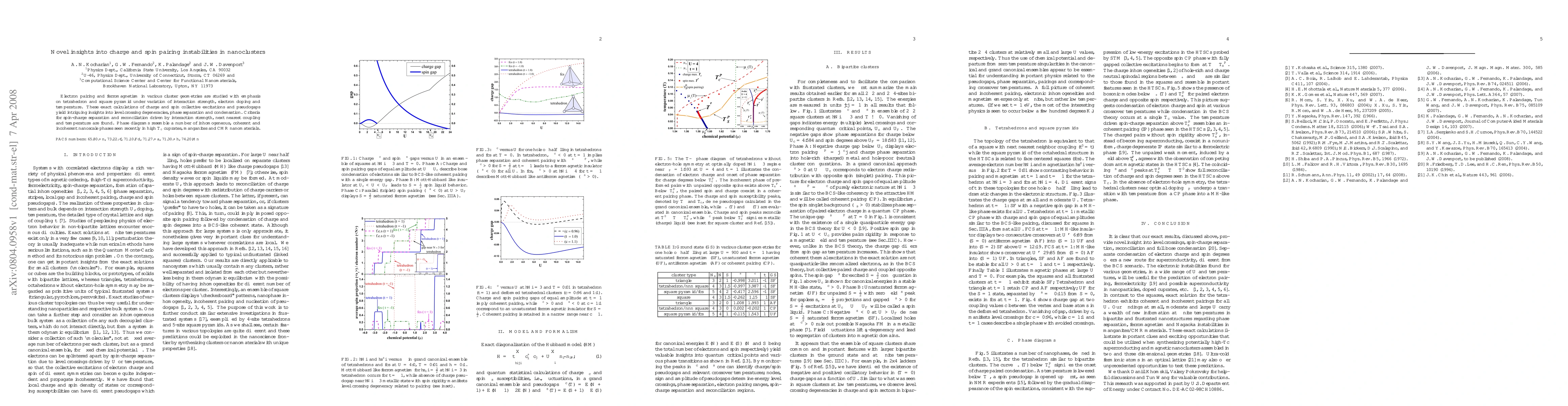 Electron pairing and ferromagnetism in various cluster geometries are studied with emphasis on tetrahedron and square pyramid under variation of interaction strength, electron doping and temperature. These exact calculations of charge and spin collective excitations and pseudogaps yield intriguing insights into level crossing degeneracies, phase separation and condensation. Criteria for spin-charge separation and reconciliation driven by interaction strength, next nearest coupling and temperature are found. Phase diagrams resemble a number of inhomogeneous, coherent and incoherent nanoscale phases seen recently in high T$_c$ cuprates, manganites and CMR nanomaterials.