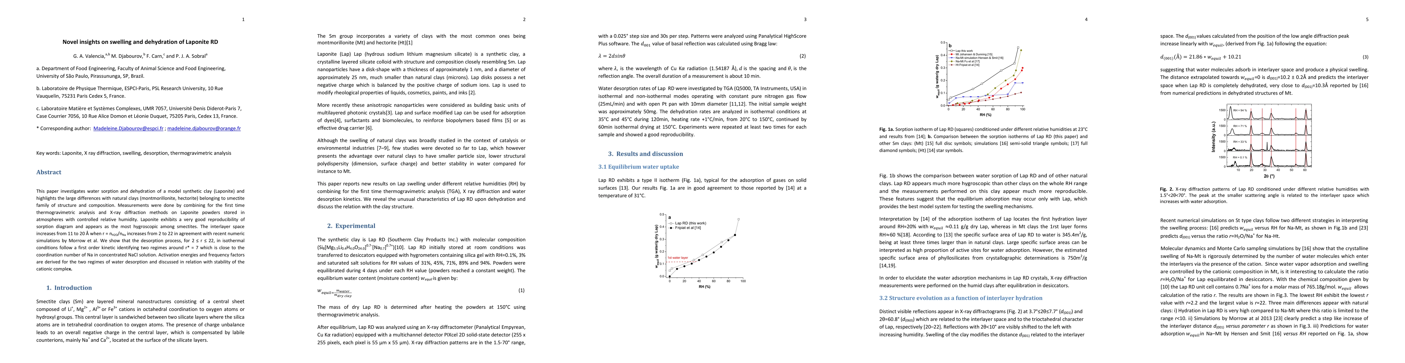 This paper investigates water sorption and dehydration of a model synthetic clay (Laponite) and highlights the large differences with natural clays (montmorillonite, hectorite) belonging to smectite family of structure and composition. Measurements were done by combining for the first time thermogravimetric analysis and X Ray diffraction methods on Laponite powders stored in atmospheres with controlled relative humidity. Laponite exhibits a very good reproducibility of sorption diagram and appears as the most hygroscopic among smectites. The interlayer space increases from 11 to 20 Angstrom when r = n H2O /n Na increases from 2 to 22 in agreement with recent numeric simulations by Morrow et al. We show that the desorption process, for 2 < r < 22, in isothermal conditions follow a first order kinetic identifying two regimes around r* = 7 which is close to the coordination number of Na in concentrated NaCl solution. Activation energies and frequency factors are derived for the two regimes of water desorption and discussed in relation with stability of the cationic complex.