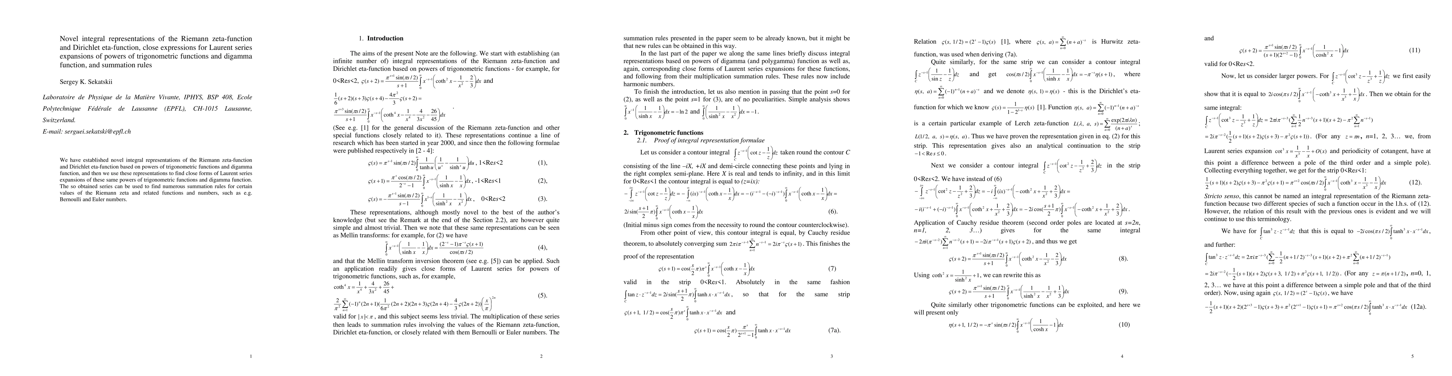 We have established novel integral representations of the Riemann zeta-function and Dirichlet eta-function based on powers of trigonometric functions and digamma function, and then use these representations to find close forms of Laurent series expansions of these same powers of trigonometric functions and digamma function. The so obtained series can be used to find numerous summation rules for certain values of the Riemann zeta and related functions and numbers, such as e.g. Bernoulli and Euler numbers.