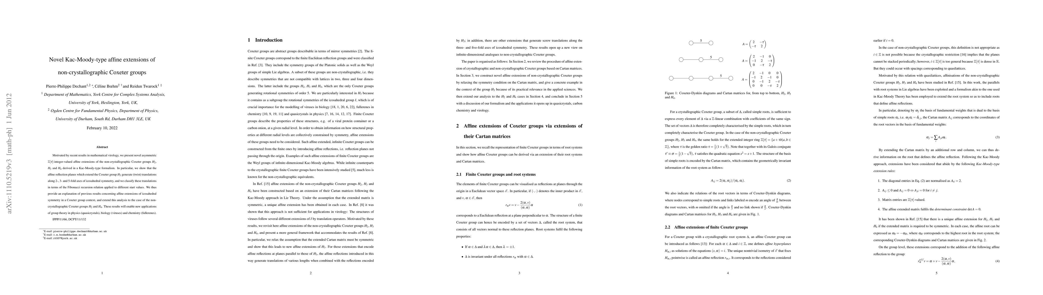 This paper introduces new Kac-Moody-type affine extensions of non-crystallographic Coxeter groups H_2, H_3, and H_4, derived using asymmetric Z[tau]-integer-valued methods. It explains how these extensions generate translations along icosahedral symmetry axes and classifies them via Fibonacci recursion, providing applications in physics, biology, and chemistry.