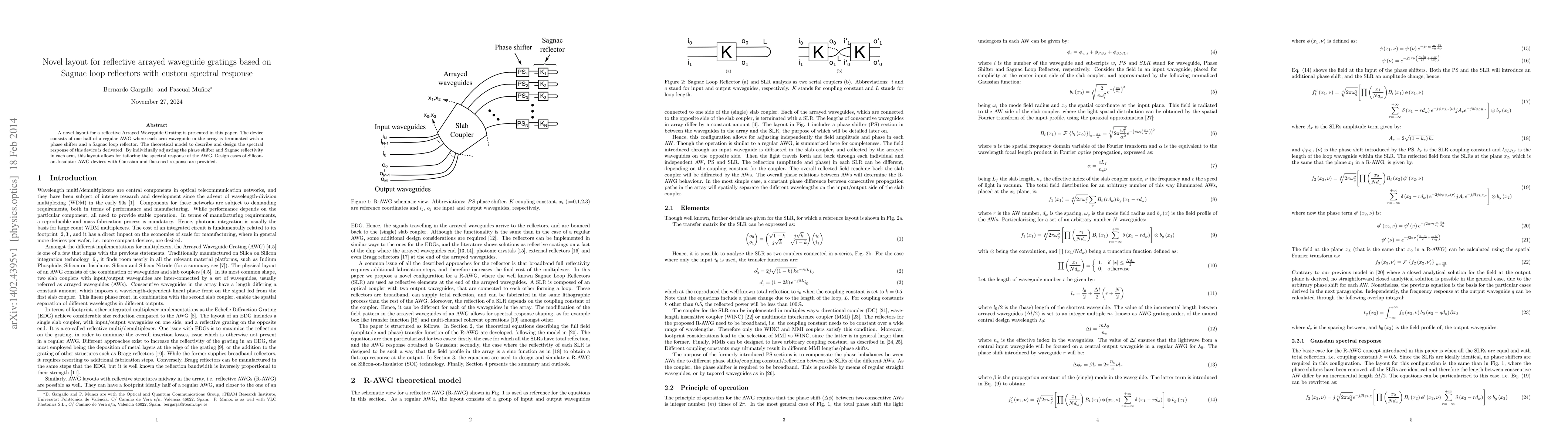 This paper introduces a novel reflective Arrayed Waveguide Grating (AWG) layout utilizing Sagnac loop reflectors and phase shifters for custom spectral response. The design allows for tailored spectral response by adjusting phase shifters and reflectors, demonstrated through Silicon-on-Insulator AWG devices with Gaussian and flattened responses.
