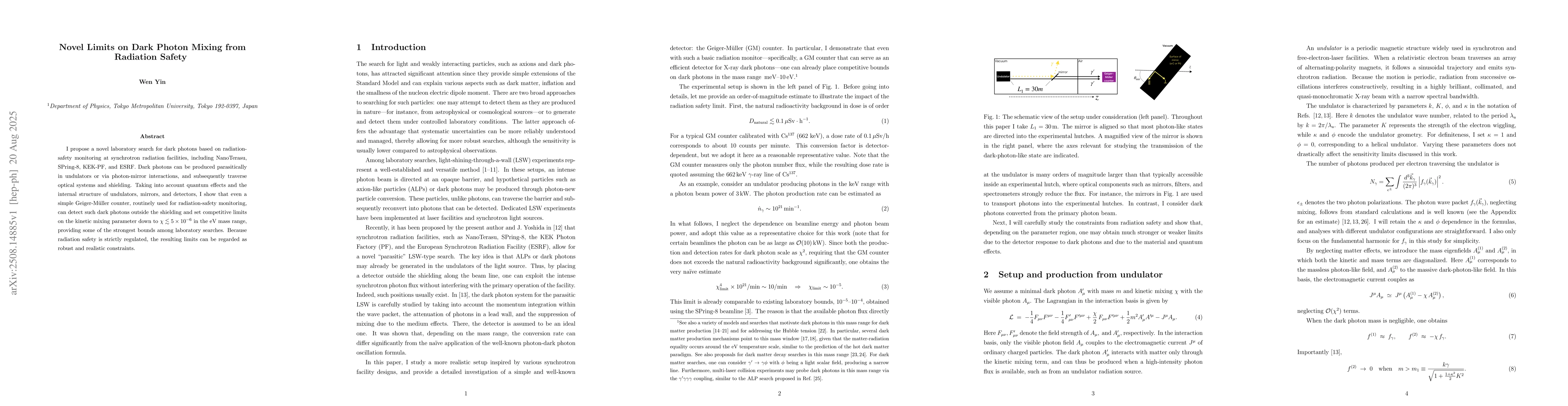 The research proposes using radiation-safety monitoring at synchrotron radiation facilities, such as NanoTerasu, SPring-8, KEK-PF, and ESRF, to search for dark photons. It analyzes the response of a simple Geiger-Müller (GM) counter to set limits on the kinetic mixing parameter (χ) of dark photons.