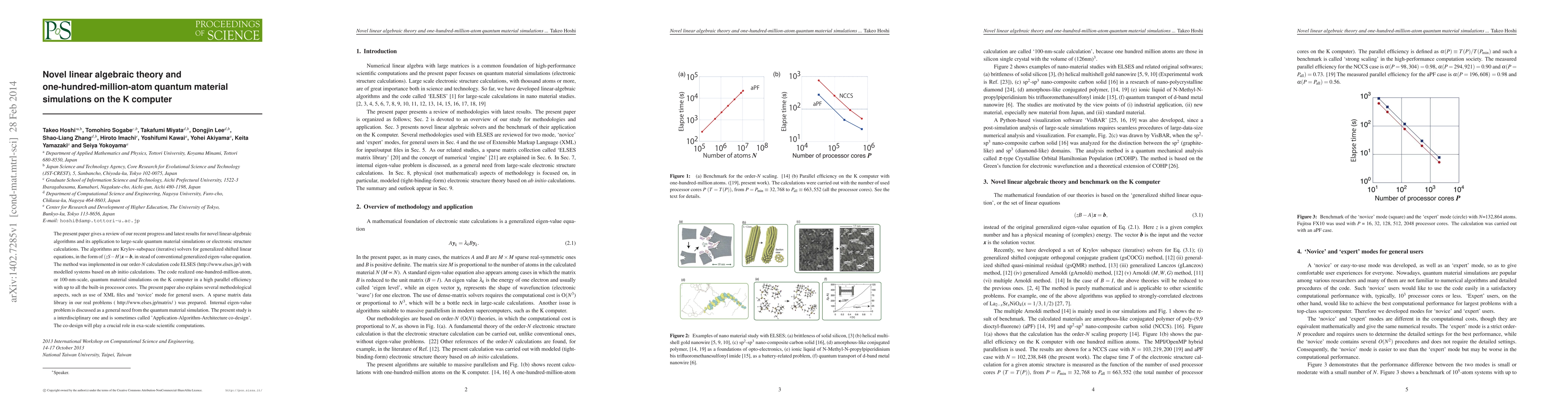 This paper reviews novel linear-algebraic algorithms for Krylov-subspace solvers applied to large-scale quantum material simulations on the K computer, achieving efficient 100-million-atom simulations. The methodology includes iterative solvers for generalized shifted linear equations and an order-$N$ calculation code, ELSES, which leverages XML files and a 'novice' mode for user accessibility.