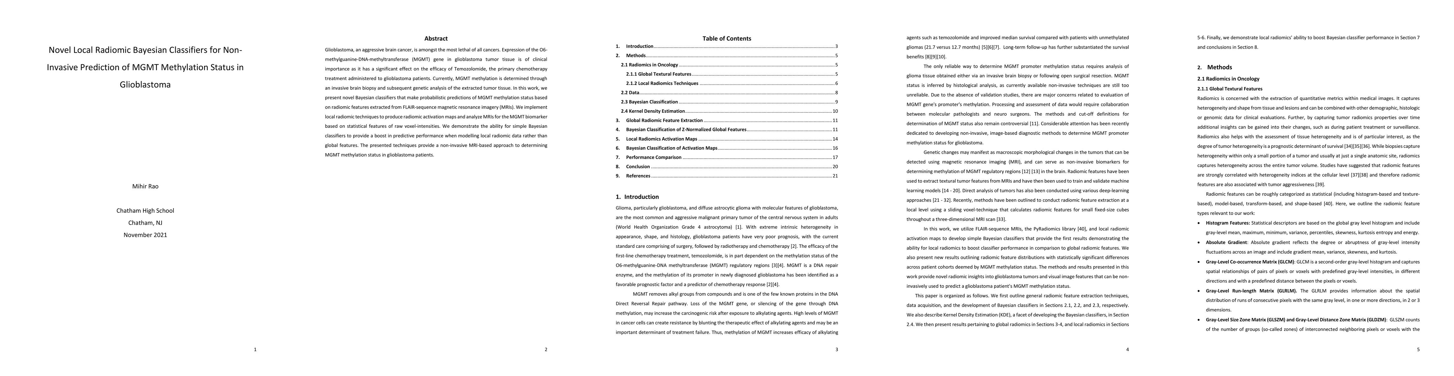 This paper introduces novel Bayesian classifiers that predict MGMT methylation status in glioblastoma using local radiomic features from FLAIR MRIs, offering a non-invasive alternative to invasive biopsies. The study shows improved predictive performance using local radiomic techniques compared to global features.