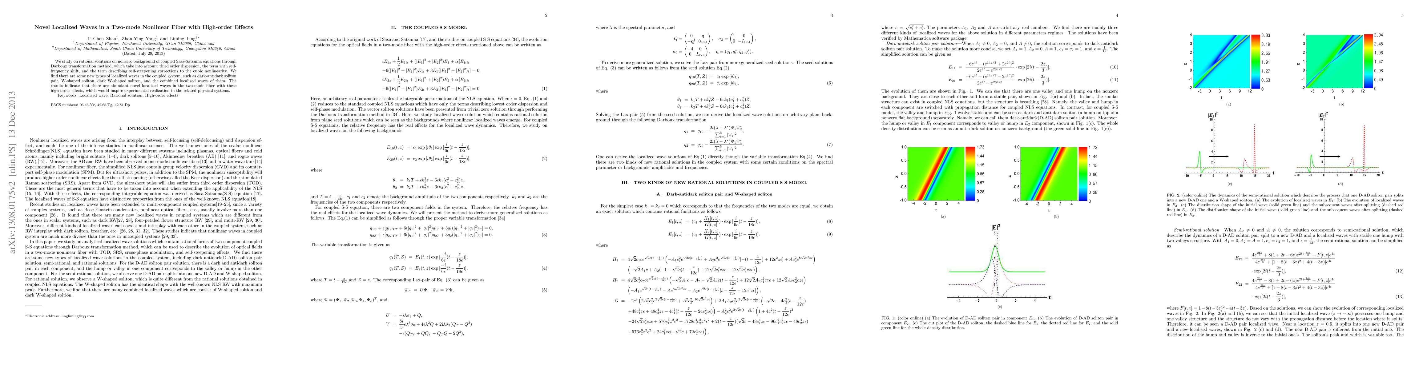 We study on rational solutions on nonzero background of coupled Sasa-Satsuma equations through Darboux transformation method, which take into account third order dispersion, the term with self-frequency shift, and the term describing self-steepening corrections to the cubic nonlinearity. We find there are some new types of localized waves in the coupled system, such as dark-antidark soliton pair, W-shaped soliton, dark W-shaped soliton, and the combined localized waves of them. The results indicate that there are abundant novel localized waves in the two-mode fiber with these high-order effects, which would inspire experimental realization in the related physical systems.