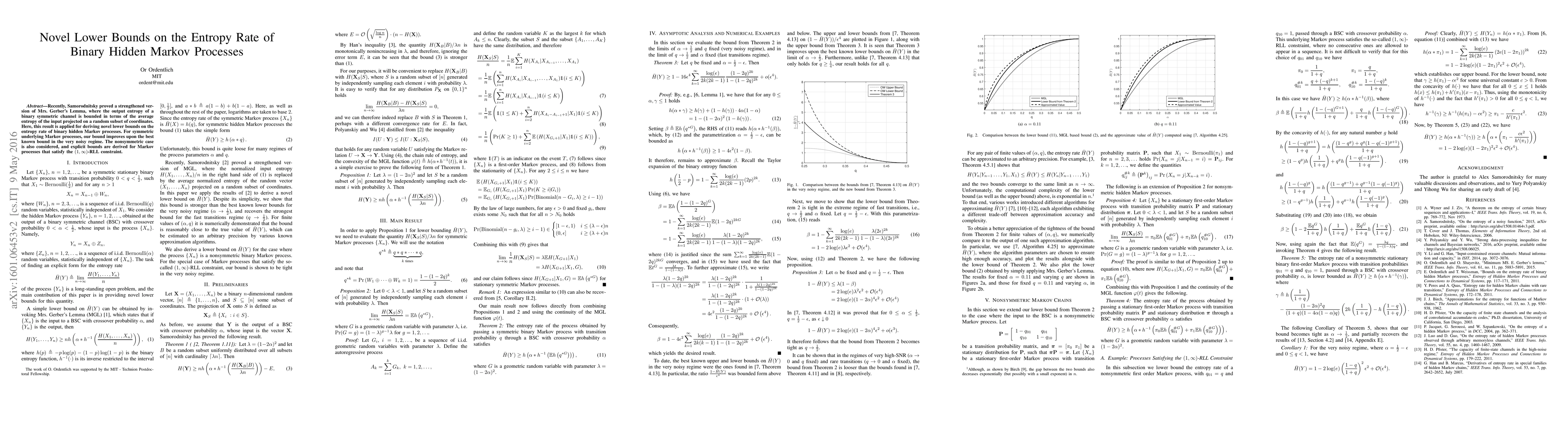 This paper establishes new lower bounds on the entropy rate of binary hidden Markov processes by leveraging a strengthened version of Mrs. Gerber's Lemma. The authors improve existing bounds for symmetric processes in the very noisy regime and derive explicit bounds for nonsymmetric processes under the $(1,\infty)$-RLL constraint.