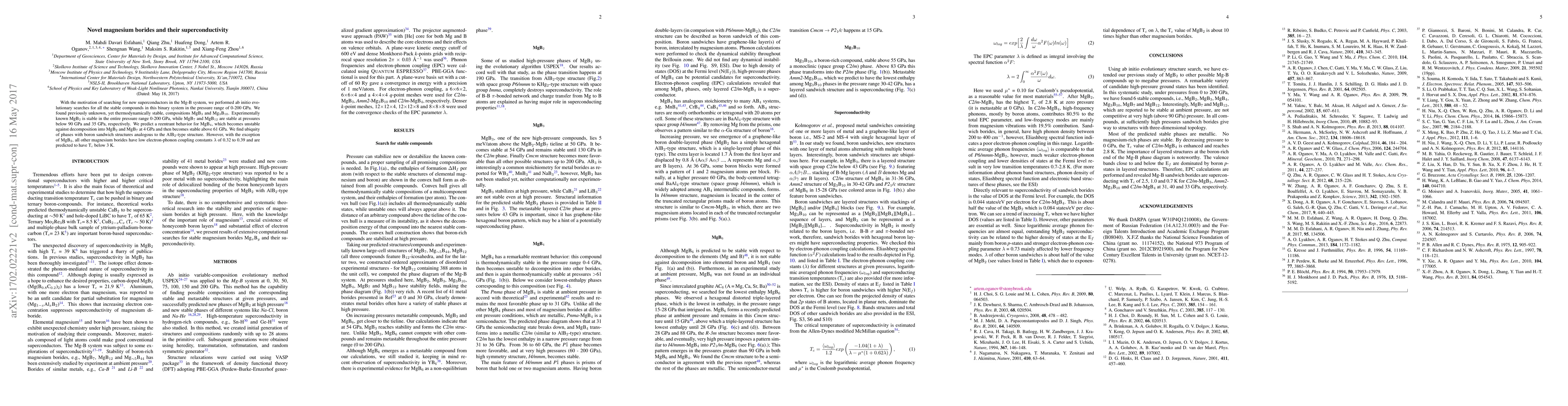 With the motivation of searching for new superconductors in the Mg-B system, we performed ab initio evolutionary searches for all the stable compounds in this binary system in the pressure range of 0-200 GPa. We found previously unknown, yet thermodynamically stable, compositions MgB$_3$ and Mg$_3$B$_{10}$. Experimentally known MgB$_2$ is stable in the entire pressure range 0-200 GPa, while MgB$_7$ and MgB$_{12}$ are stable at pressures below 90 GPa and 35 GPa, respectively. We predict a reentrant behavior for MgB$_4$, which becomes unstable against decomposition into MgB$_2$ and MgB$_7$ at 4 GPa and then becomes stable above 61 GPa. We find ubiquity of phases with boron sandwich structures analogous to the AlB$_2$-type structure. However, with the exception of MgB$_2$, all other magnesium borides have low electron-phonon coupling constants $\lambda$ of 0.32 to 0.39 and are predicted to have T$_c$ below 3 K.