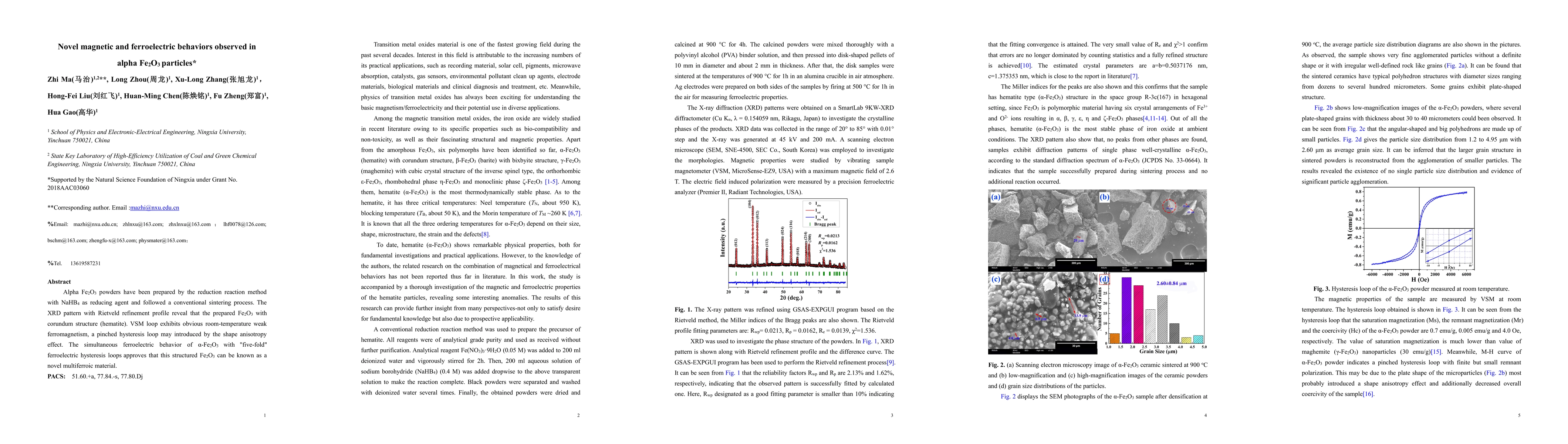 Summary: Researchers synthesized alpha Fe2O3 (hematite) via a reduction reaction and sintering, revealing a corundum structure. The material exhibits room-temperature weak ferromagnetism and unique "five-fold" ferroelectric hysteresis loops, demonstrating its potential as a novel multiferroic material.