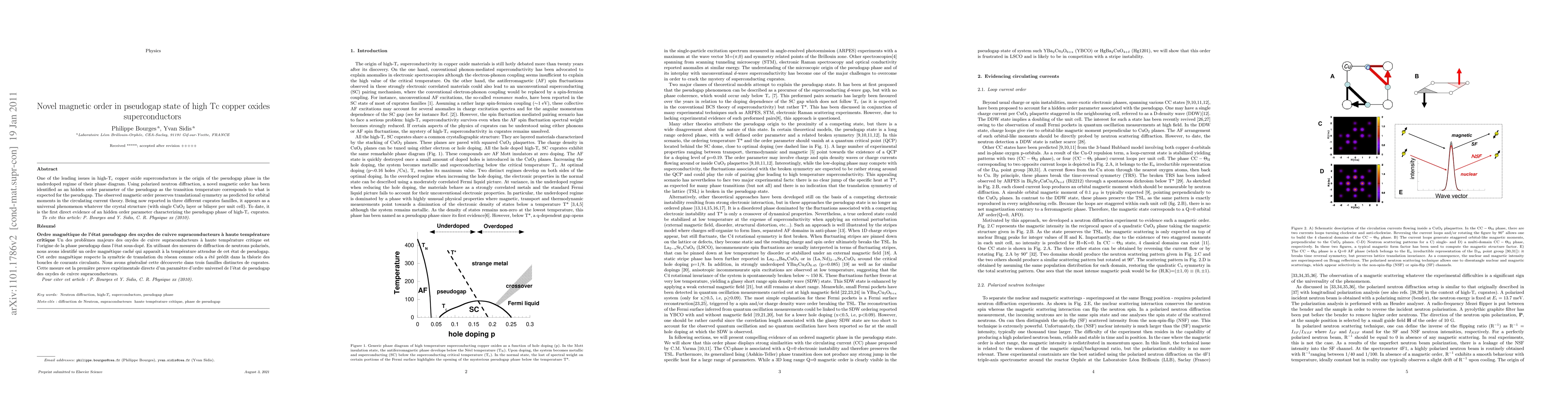 One of the leading issues in high-$\rm T_c$ copper oxide superconductors is the origin of the pseudogap phase in the underdoped regime of their phase diagram. Using polarized neutron diffraction, a novel magnetic order has been identified as an hidden order parameter of the pseudogap as the transition temperature corresponds to what is expected for the pseudogap. The observed magnetic order preserves translational symmetry as predicted for orbital moments in the circulating current theory. Being now reported in three different cuprates familles, it appears as a universal phenomenon whatever the crystal structure (with single CuO$_2$ layer or bilayer per unit cell). To date, it is the first direct evidence of an hidden order parameter characterizing the pseudogap phase of high-$\rm T_c$ cuprates.