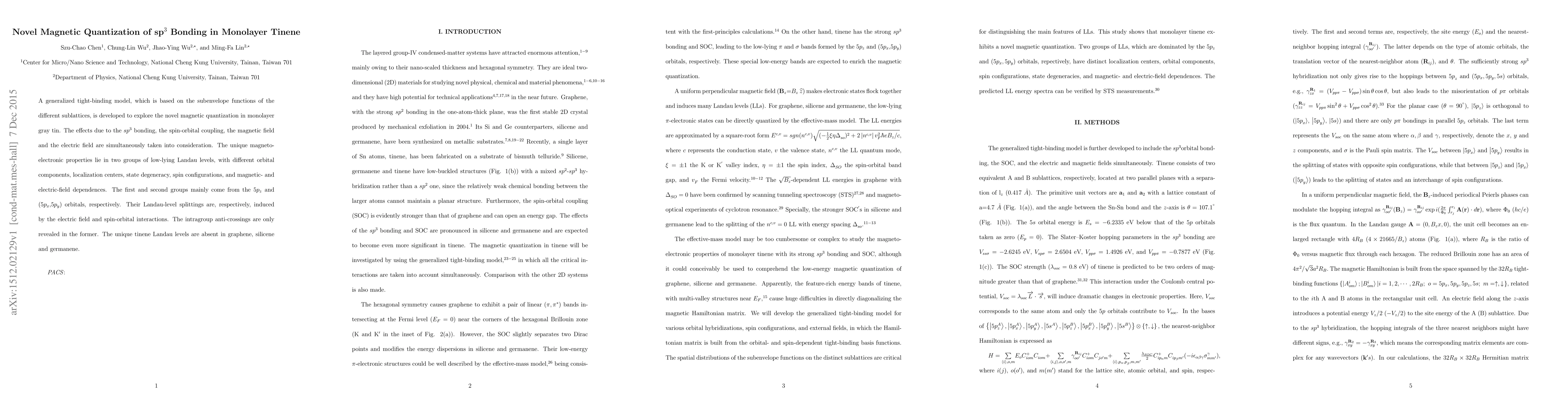 A generalized tight-binding model, which is based on the subenvelope functions of the different sublattices, is developed to explore the novel magnetic quantization in monolayer gray tin. The effects due to the $sp^{3}$ bonding, the spin-orbital coupling, the magnetic field and the electric field are simultaneously taken into consideration. The unique magneto-electronic properties lie in two groups of low-lying Landau levels, with different orbital components, localization centers, state degeneracy, spin configurations, and magnetic- and electric-field dependences. The first and second groups mainly come from the $5p_{z}$ and ($5p_{x}$,$5p_{y}$) orbitals, respectively. Their Landau-level splittings are, respectively, induced by the electric field and spin-orbital interactions. The intragroup anti-crossings are only revealed in the former. The unique tinene Landau levels are absent in graphene, silicene and germanene.