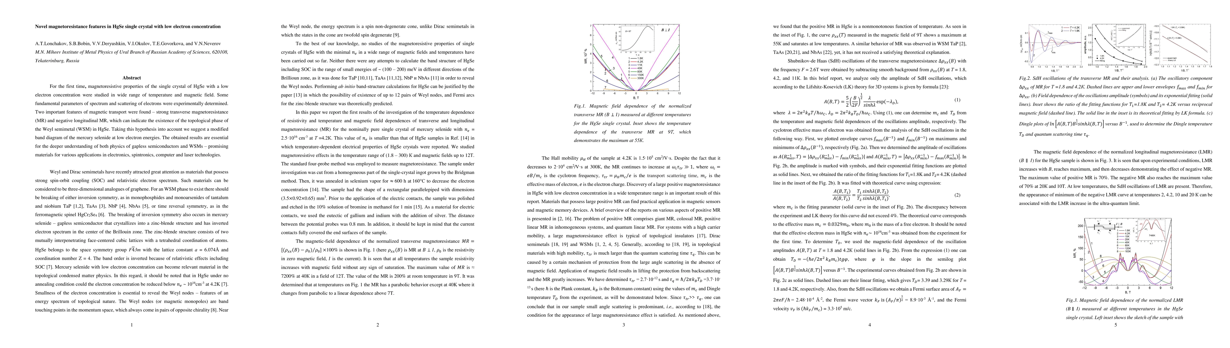 For the first time, magnetoresistive properties of the single crystal of HgSe with a low electron concentration were studied in wide range of temperature and magnetic field. Some fundamental parameters of spectrum and scattering of electrons were experimentally determined. Two important features of magnetic transport were found - strong transverse magnetoresistance (MR) and negative longitudinal MR, which can indicate the existence of the topological phase of the Weyl semimetal (WSM) in HgSe. Taking this hypothesis into account we suggest a modified band diagram of the mercury selenide at low electron energies. The obtained results are essential for the deeper understanding of both physics of gapless semiconductors and WSMs - promising materials for various applications in electronics, spintronics, computer and laser technologies.