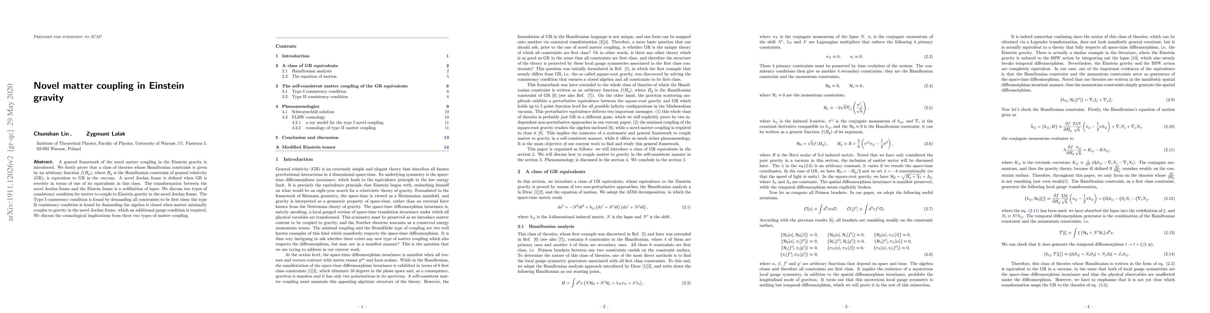 A general framework of the novel matter coupling in the Einstein gravity is introduced. We firstly prove that a class of theories whose Hamiltonian constraint is given by an arbitrary function $f(H_g)$, where $H_g$ is the Hamiltonian constraint of general relativity (GR), is equivalent to GR in the vaccum. A novel Jordan frame is defined when GR is rewritte in terms of one of its equivalents in this class. The transformation between the novel Jordan frame and the Eintein frame is a redifinition of lapse. We discuss two types of consistency condition for matter to couple to Einstein gravity in the novel Jordan frame. The Type I consistency condition is found by demanding all constraints to be first class; the type II consistency condition is found by demanding the algebra is closed when matter minimally couples to gravity in the novel Jordan frame, which an additional gauge condition is required. We discuss the cosmological implications from these two types of matter coupling.
