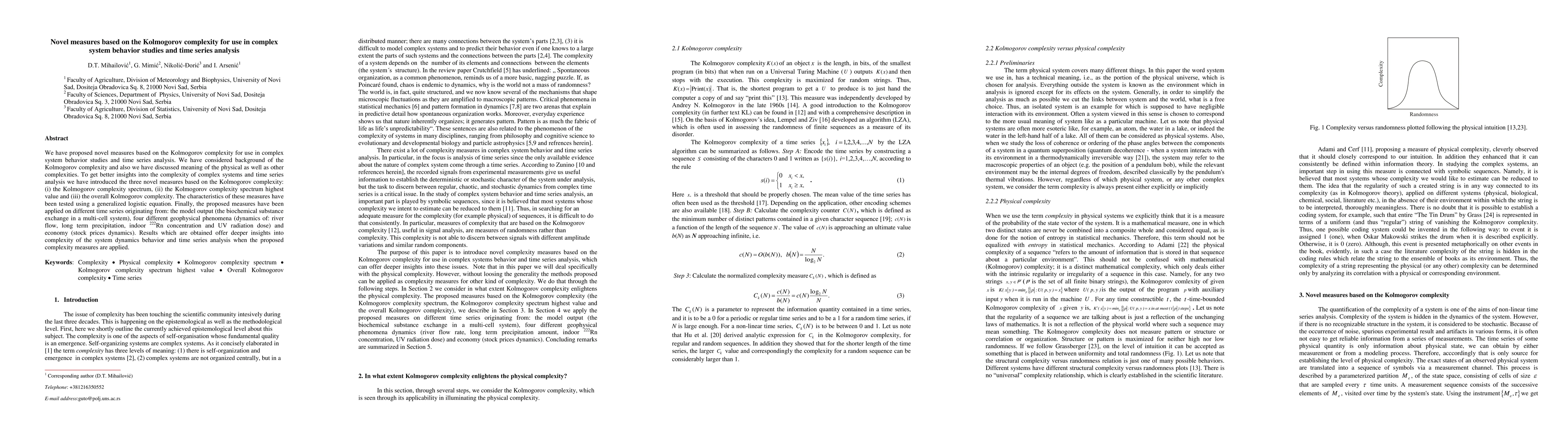 This paper introduces three novel measures based on Kolmogorov complexity for studying complex system behavior and time series analysis. The proposed measures—Kolmogorov complexity spectrum, highest value, and overall complexity—are tested on various time series from diverse fields, providing deeper insights into system dynamics.