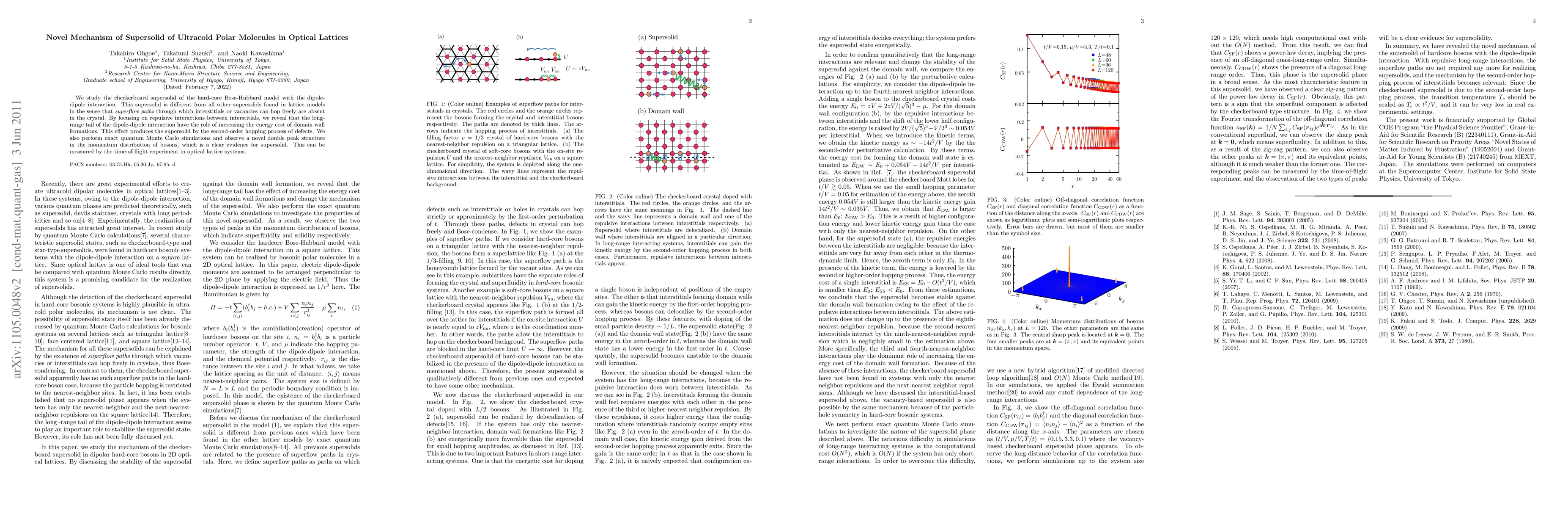 We study the checkerboard supersolid of the hard-core Bose-Hubbard model with the dipole-dipole interaction. This supersolid is different from all other supersolids found in lattice models in the sense that superflow paths through which interstitials or vacancies can hop freely are absent in the crystal. By focusing on repulsive interactions between interstitials, we reveal that the long-range tail of the dipole-dipole interaction have the role of increasing the energy cost of domain wall formations. This effect produces the supersolid by the second-order hopping process of defects. We also perform exact quantum Monte Carlo simulations and observe a novel double peak structure in the momentum distribution of bosons, which is a clear evidence for supersolid. This can be measured by the time-of-flight experiment in optical lattice systems.