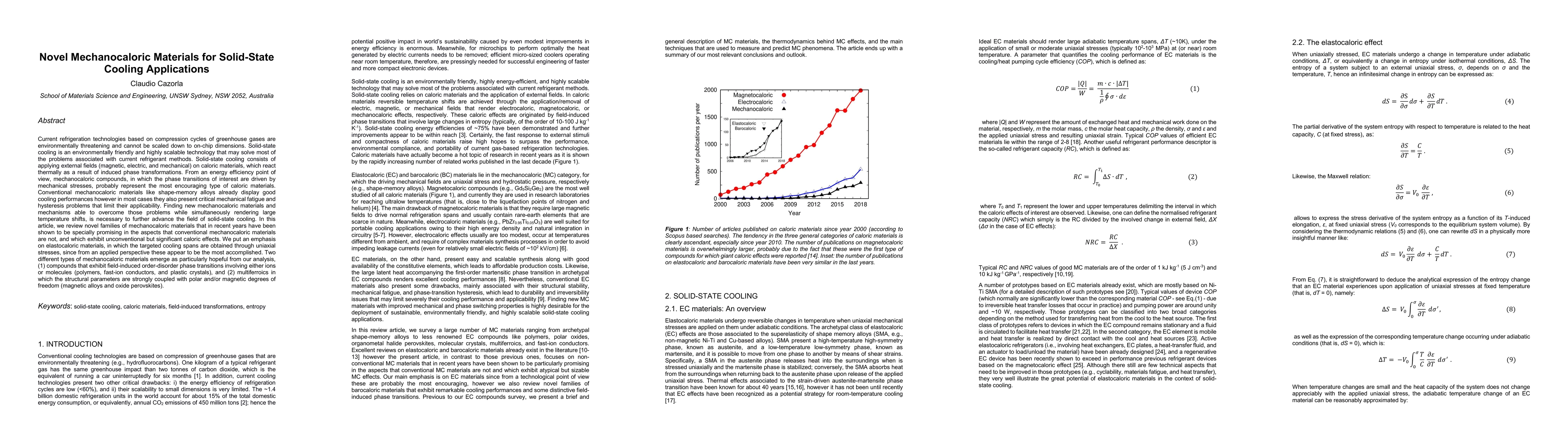 This paper reviews novel mechanocaloric materials for solid-state cooling, focusing on those that overcome mechanical fatigue and hysteresis issues of conventional materials. Elastocaloric materials, particularly those with field-induced order disorder phase transitions and multiferroics, show significant promise for efficient cooling applications.