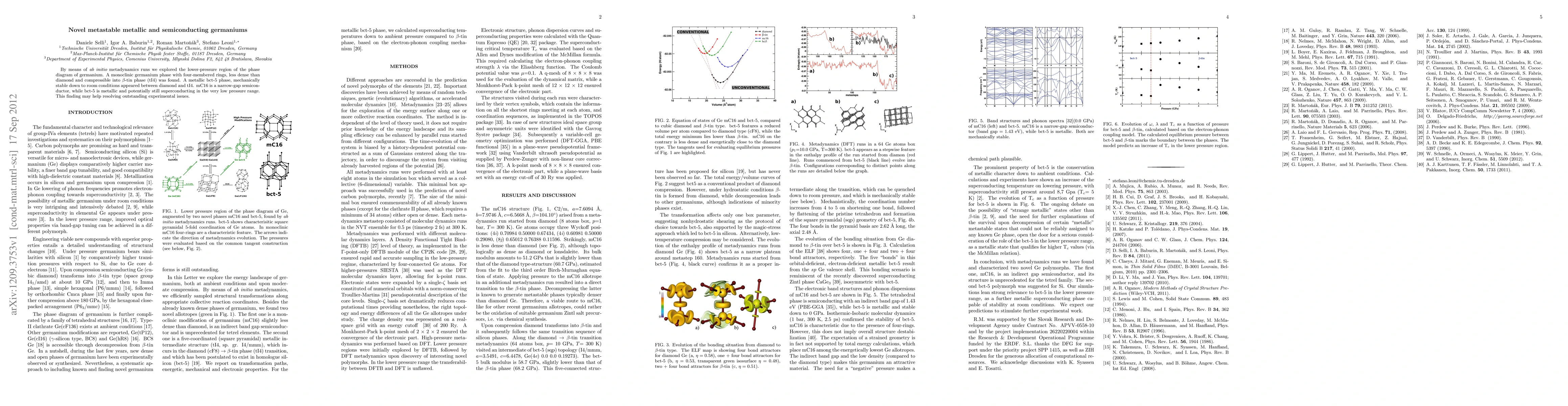 By means of ab initio metadynamics runs we explored the lower-pressure region of the phase diagram of germanium. A monoclinic germanium phase with four-membered rings, less dense than diamond and compressible into \beta-tin phase (tI4) was found. A metallic bct-5 phase, mechanically stable down to room conditions appeared between diamond and tI4. mC16 is a narrow-gap semiconductor, while bct-5 is metallic and potentially still superconducting in the very low pressure range. This finding may help resolving outstanding experimental issues.