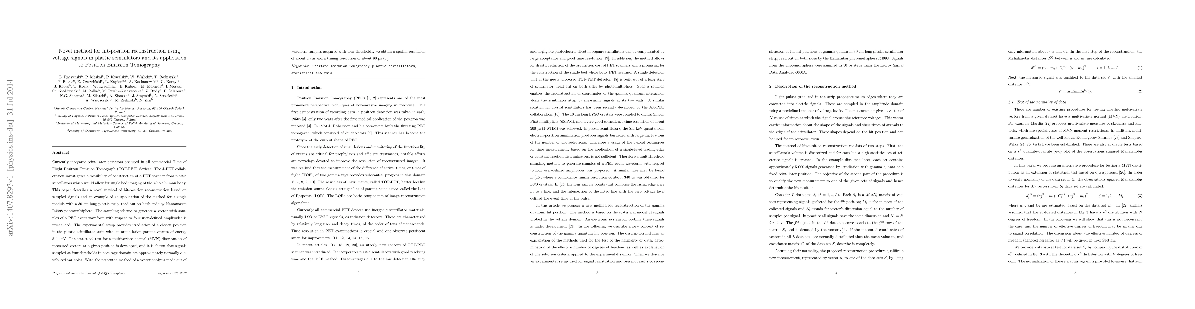 This paper introduces a novel method for hit-position reconstruction using voltage signals in plastic scintillators, applied to PET imaging. The method employs a sampling scheme to generate vectors from PET event waveforms, achieving a spatial resolution of about 1 cm and a timing resolution of about 80 ps.
