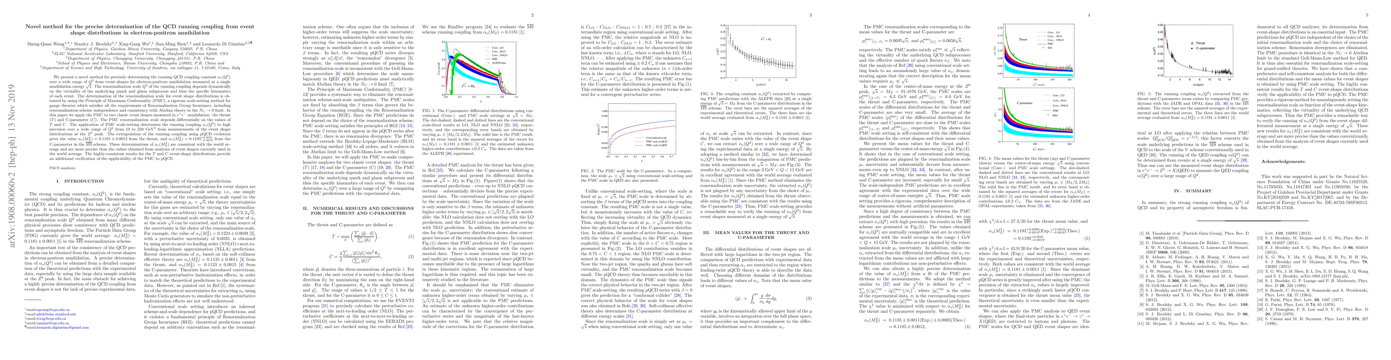 We present a novel method for precisely determining the running QCD coupling constant $\alpha_s(Q^2)$ over a wide range of $Q^2$ from event shapes for electron-positron annihilation measured at a single annihilation energy $\sqrt{s}$. The renormalization scale $Q^2$ of the running coupling depends dynamically on the virtuality of the underlying quark and gluon subprocess and thus the specific kinematics of each event. The determination of the renormalization scale for event shape distributions is obtained by using the Principle of Maximum Conformality (PMC), a rigorous scale-setting method for gauge theories which satisfies all the requirements of Renormalization Group Invariance, including renormalization-scheme independence and consistency with Abelian theory in the $N_C \to 0$ limit. In this paper we apply the PMC to two classic event shapes measured in $e^+ e^-$ annihilation: the thrust ($T$) and C-parameter ($C$). The PMC renormalization scale depends differentially on the values of $T$ and $C$. The application of PMC scale-setting determines the running coupling $\alpha_s(Q^2)$ to high precision over a wide range of $Q^2$ from $10$ to $250~\rm{GeV}^2$ from measurements of the event shape distributions at the $Z^0$ peak. The extrapolation of the running coupling using pQCD evolution gives the value $\alpha_s(M^2_Z)=0.1185\pm0.0012$ from the thrust, and $\alpha_s(M^2_Z)=0.1193^{+0.0021}_{-0.0019}$ from the C-parameter in the $\bar{\rm{MS}}$ scheme. These determinations of $\alpha_s(M^2_Z)$ are consistent with the world average and are more precise than the values obtained from analyses of event shapes currently used in the world average. The highly-consistent results for the $T$ and $C$ event-shape distributions provide an additional verification of the applicability of the PMC to pQCD.